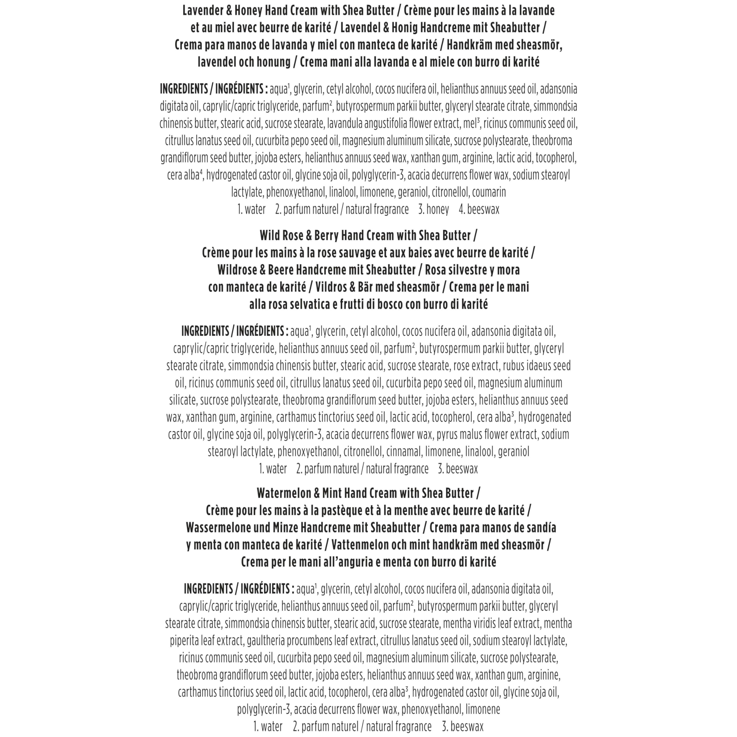 THREE DELIGHTFUL SCENTS: Hand cream set includes three gorgeous fragrances—Lavender and Honey, Wild Rose and Berry, and Watermelon and Mint—to indulge the sense while softening rough, dry hands