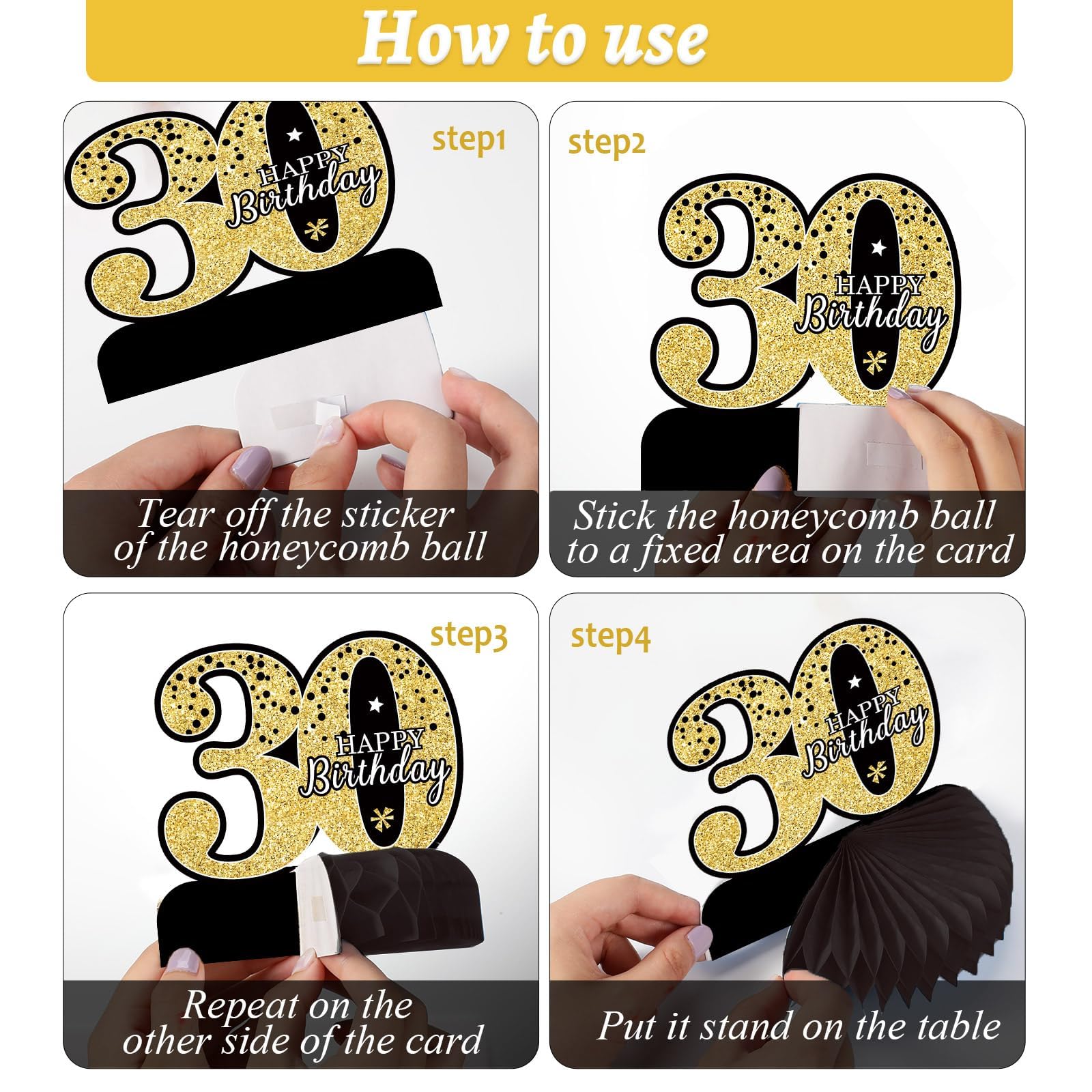 How to use: Step1, tear off the sticker of the honeycomb ball. Step 2, stick the honeycomb ball to a fixed area on the card. Step 3, repeat on the other side of the card. Step 4,finally put it stand on the table. It's so easy that you can save a lot of time .