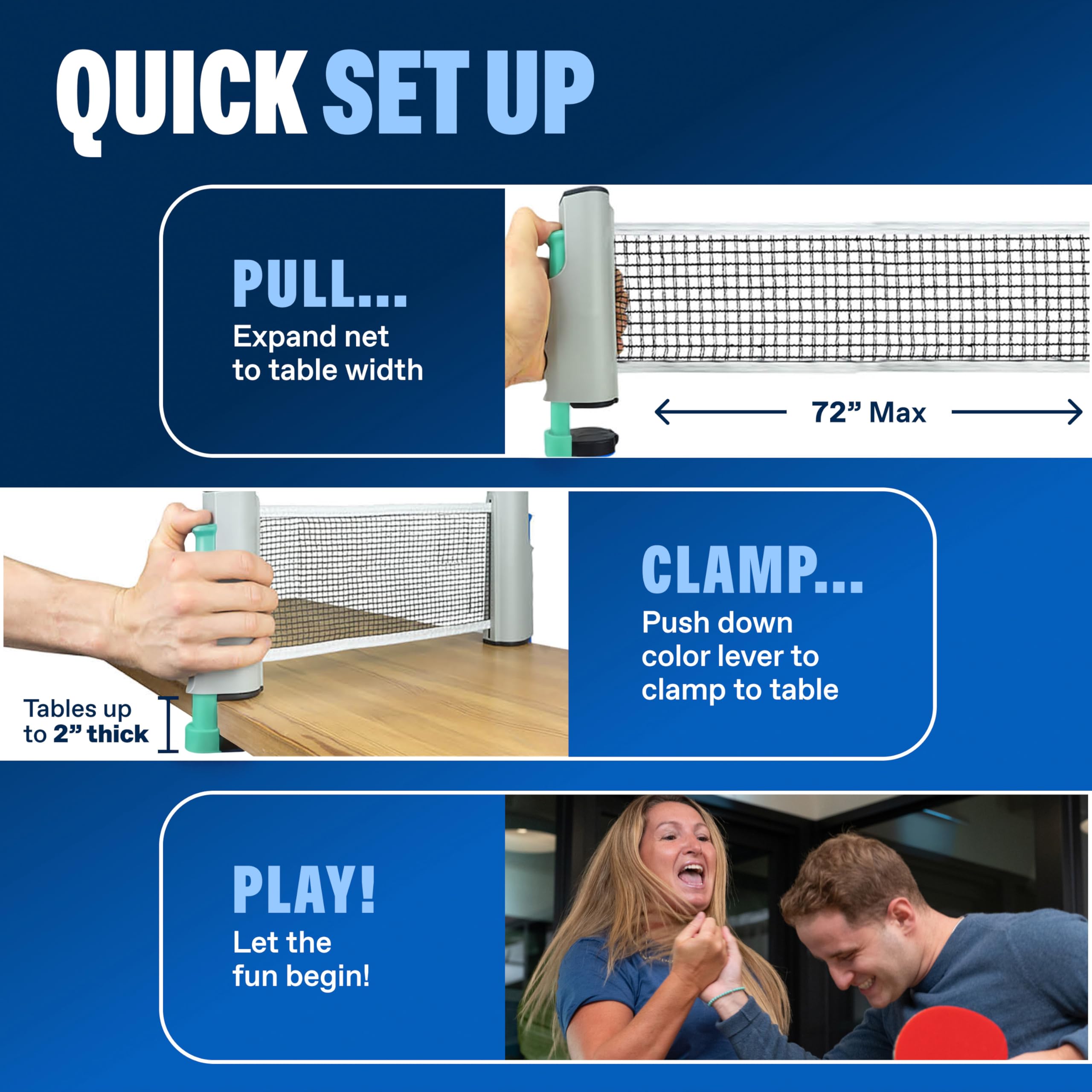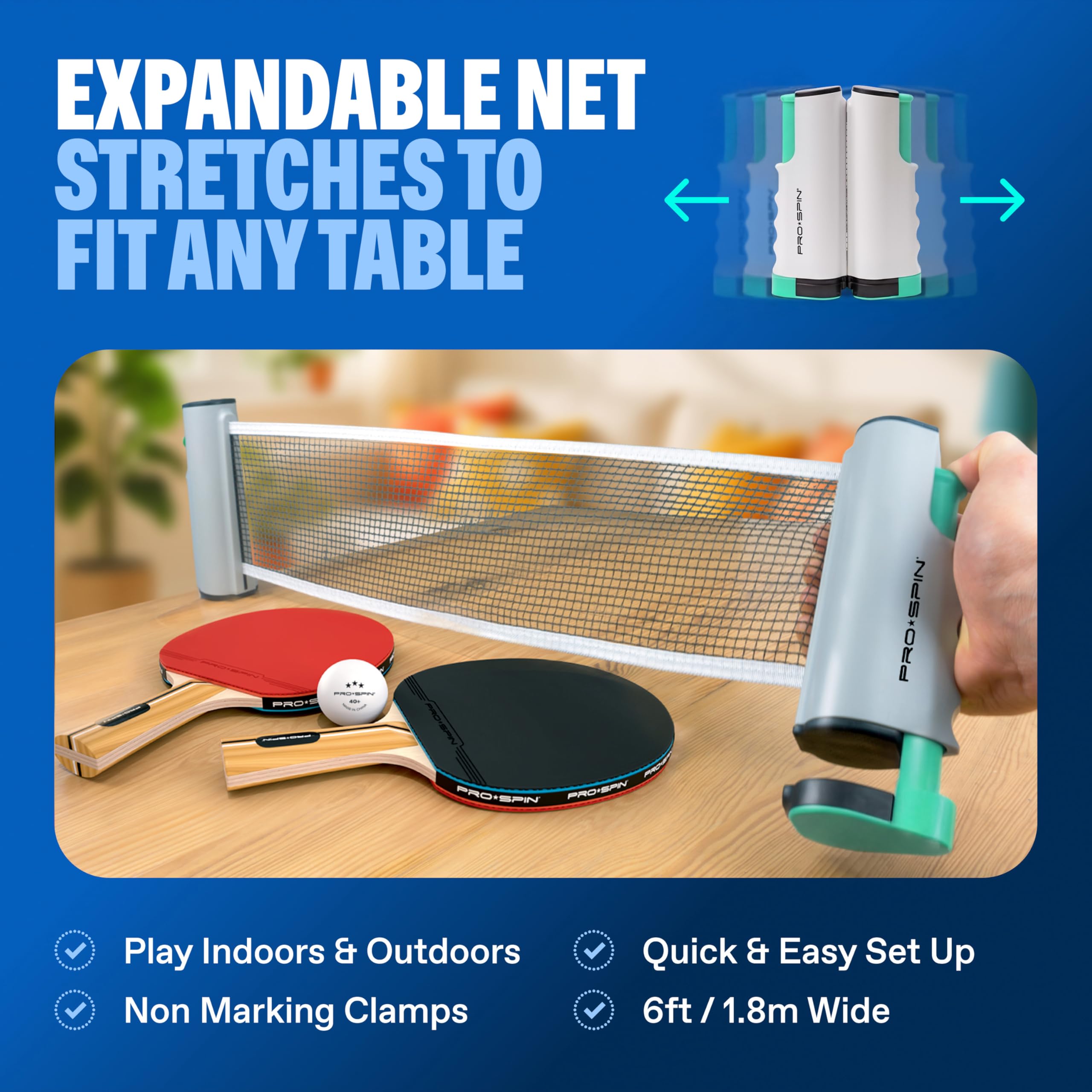 PORTABLE TABLE TENNIS NET - Turn any table into a ping pong table with our retractable net. No need for a full-size ping pong table! Versatile and lightweight, enjoy ping pong fun wherever you go. Experience thrilling matches and friendly competitions on any table, anytime!