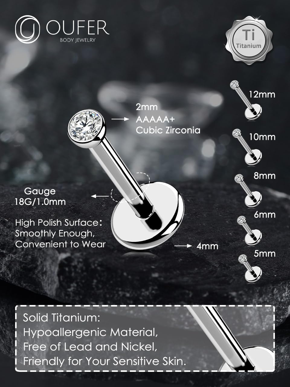 【Standard Nose Studs Size】: Gauge = 18g(1.0mm), bar length = 6mm(15/64''), diameter of CZ = 2mm. The flat back studs are normal and standard size for nose helix tragus labret piercing jewelry.