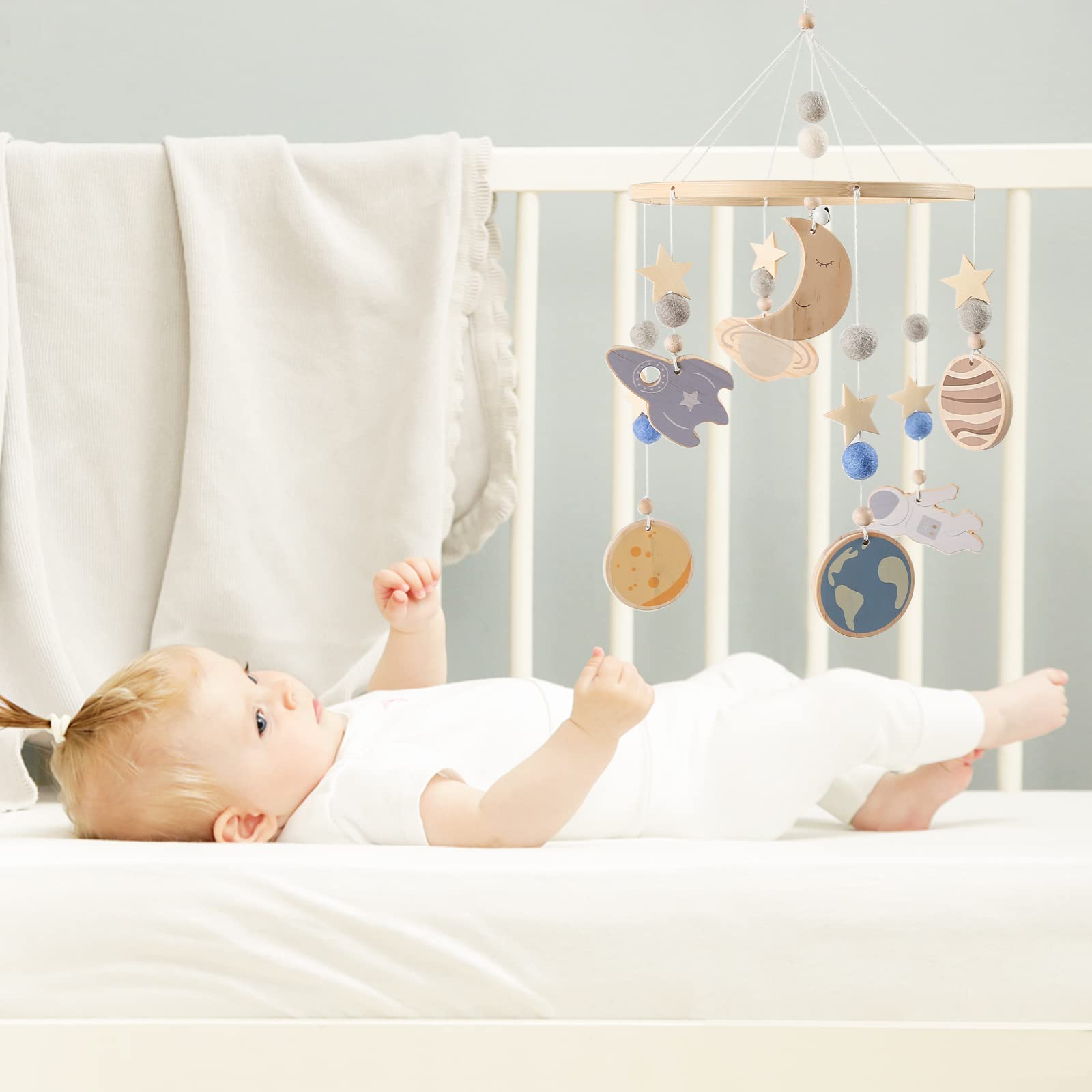 Exquisite Gift for Baby: baby mobile for crib is a beautiful and can make the baby quickly like the gift. It is hung with stars, moons, astronauts, planes and planets, exquisite workmanship, each of which the baby likes and can quickly calm the baby down.