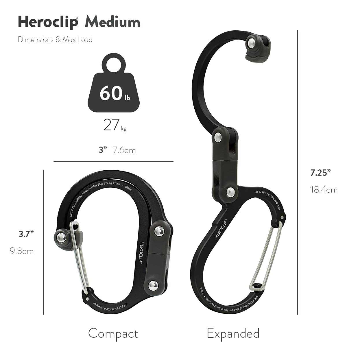 The ideal size for handling large and awkward items, Heroclip Medium gear clip lets you hook and hang big backpacks from trees, duffle bags from fences, buckets from ladders, and carry-ons from bathroom stalls. The versatile gear clip hangs securely, rotates 360°, and folds compactly in ways other carabiners, clips and hooks can’t, helping you keep your gear organized and exactly where you want it, no matter the activity. The wide carabiner clip gate accommodates bigger stuff compared with standard carabiners and clips, so you can secure anything from extension cord bundles to multiple shopping bags. The hook features a grippy rubber tip for hanging bags and purses from tables and other flat surfaces. Perfect for travel, hiking, backpacks, totes, cables and extension cords, buckets, strollers, purses, shopping bags, suitcases, kids gear, dog leashes, horse bridles and tack, first aid kits, ropes, growlers, trailers, helmets, boots, DIY, EDC, and more.