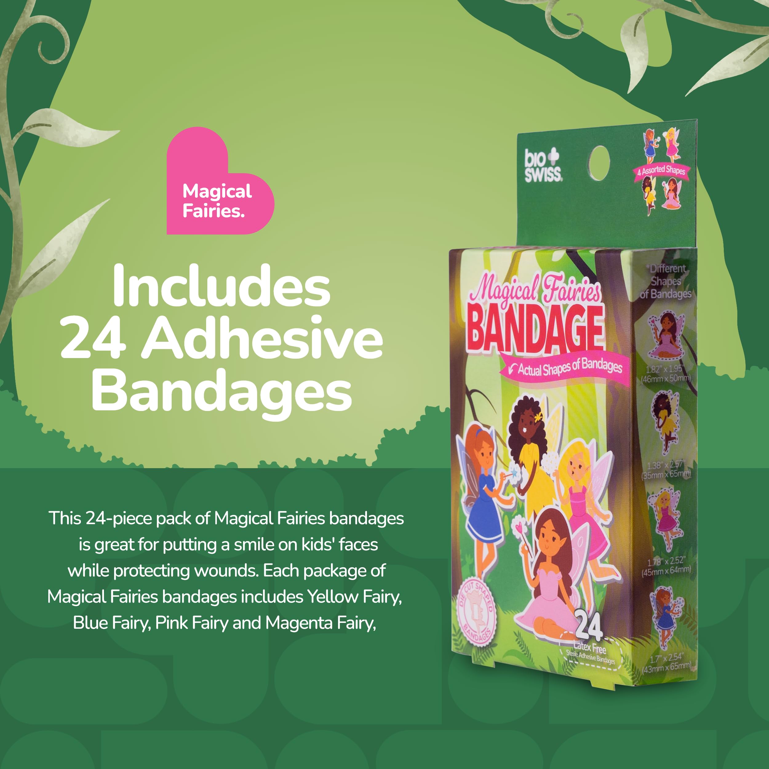MAGICAL FAIRY BANDAGES: This 24 piece pack of fairy shaped bandages features 4 fun magic fairy shapes, and is great for putting a smile on kids' faces while protecting wounds such as cuts, scrapes, and burns; sticky bandages come in a cute cardboard box and are perfect for kids and adults alike, and also for school nurses and pediatric doctors