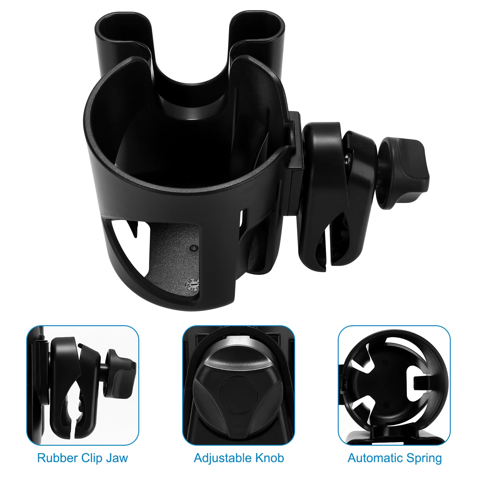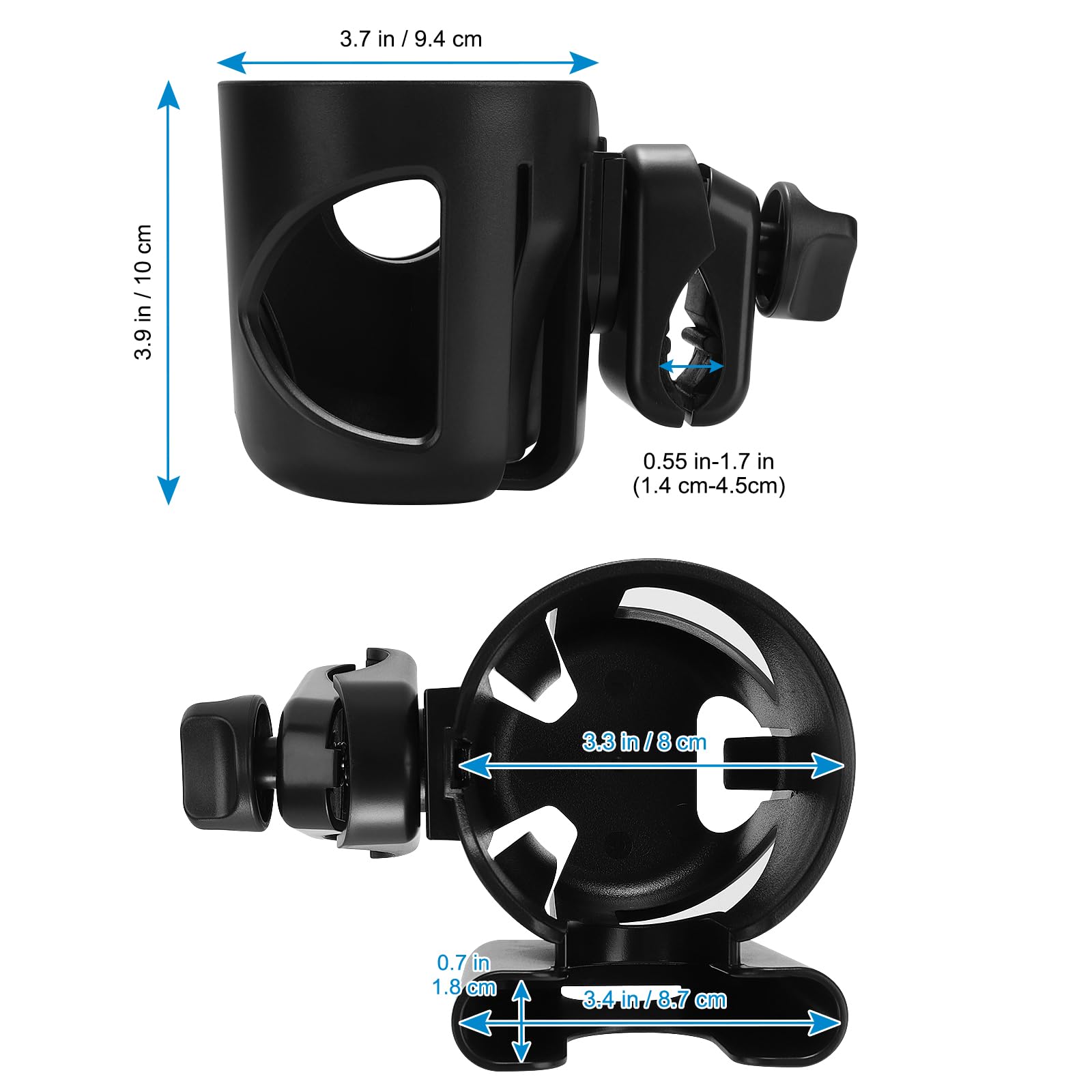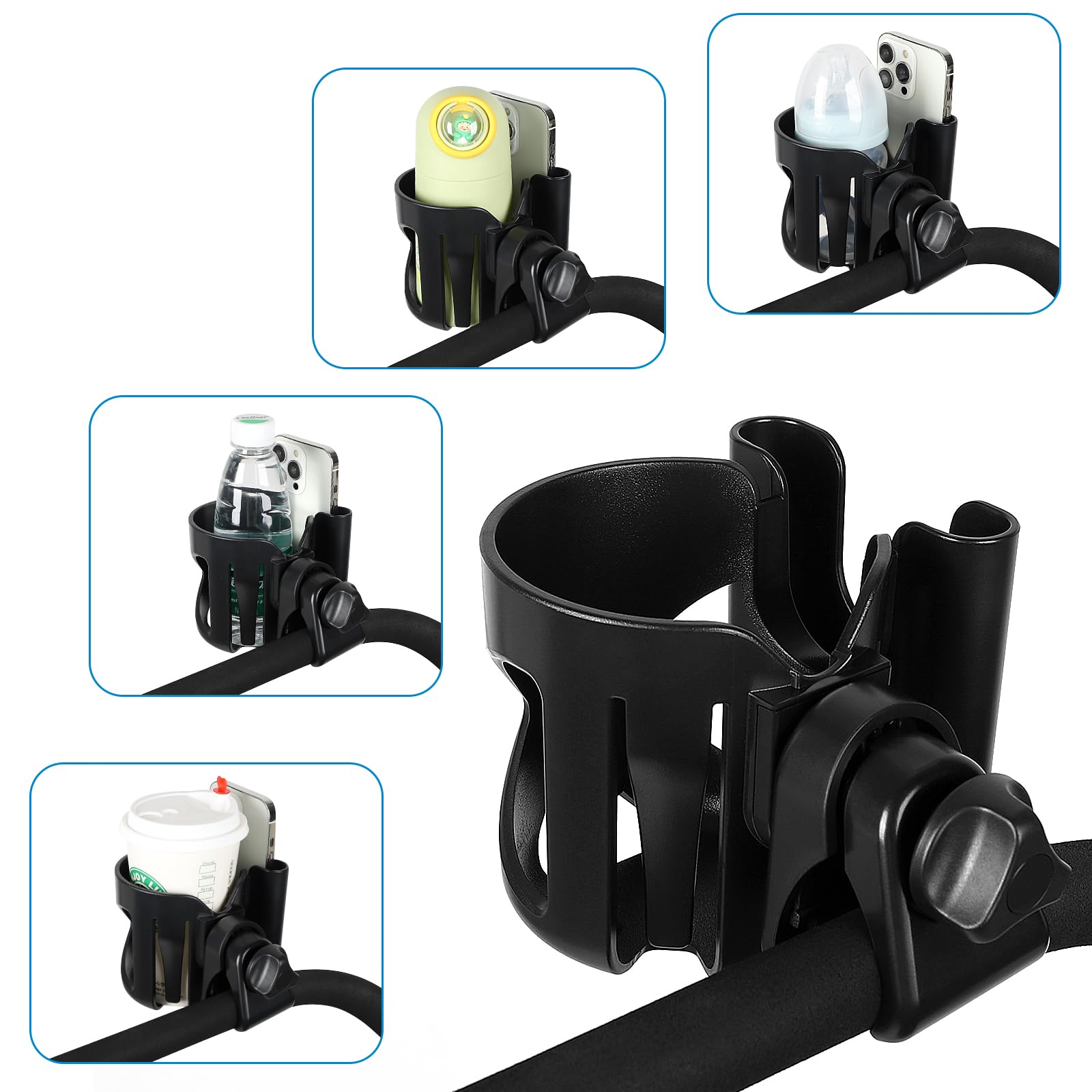 Multifunctional cup holder could be used for stroller, wheelchair, walker, bike, scooter, armrest, trolleys, pushchair, lawnmowers, ATV, treadmill, golf cart, shopping cart, kayak, boat handlebar, motorcycle, beach chair etc.