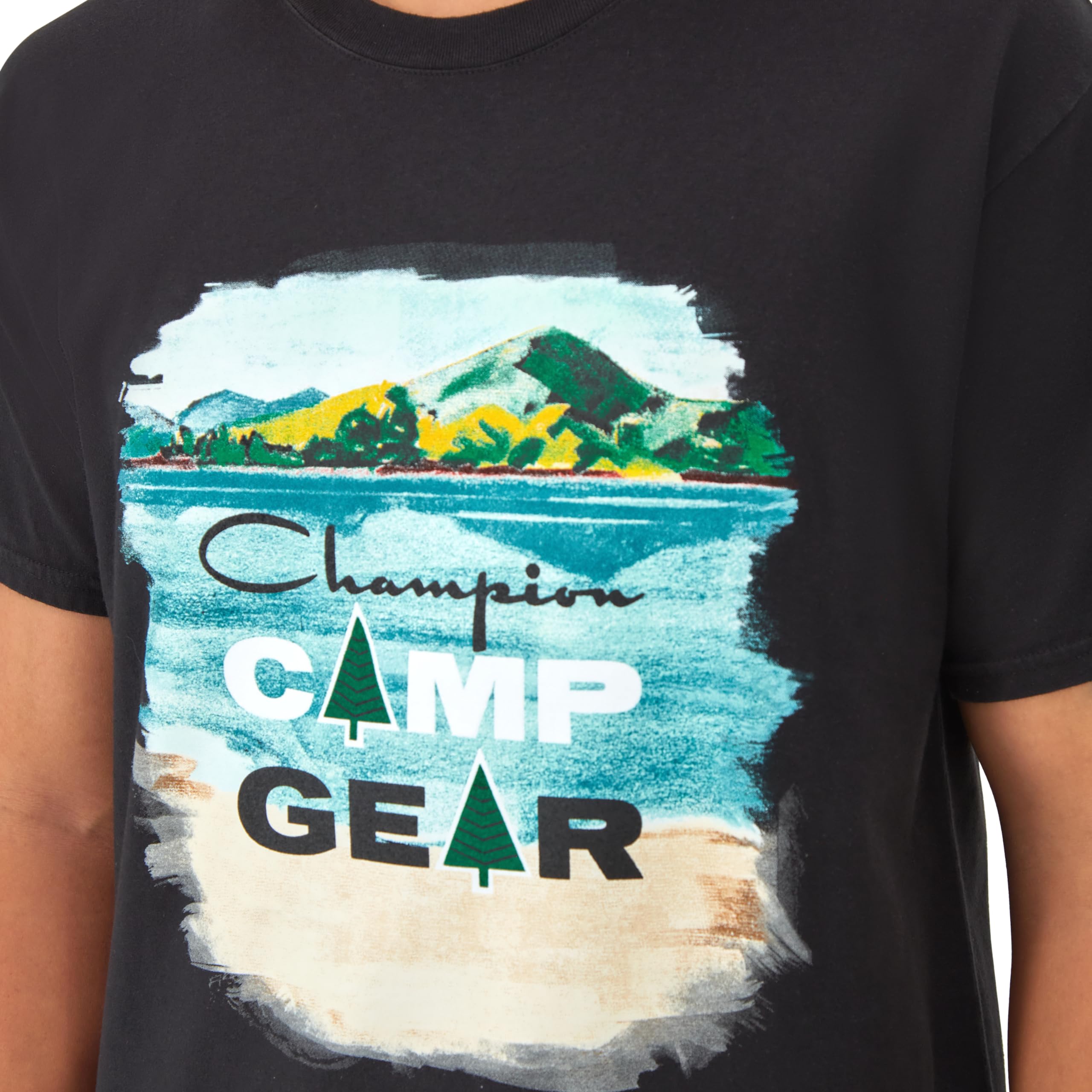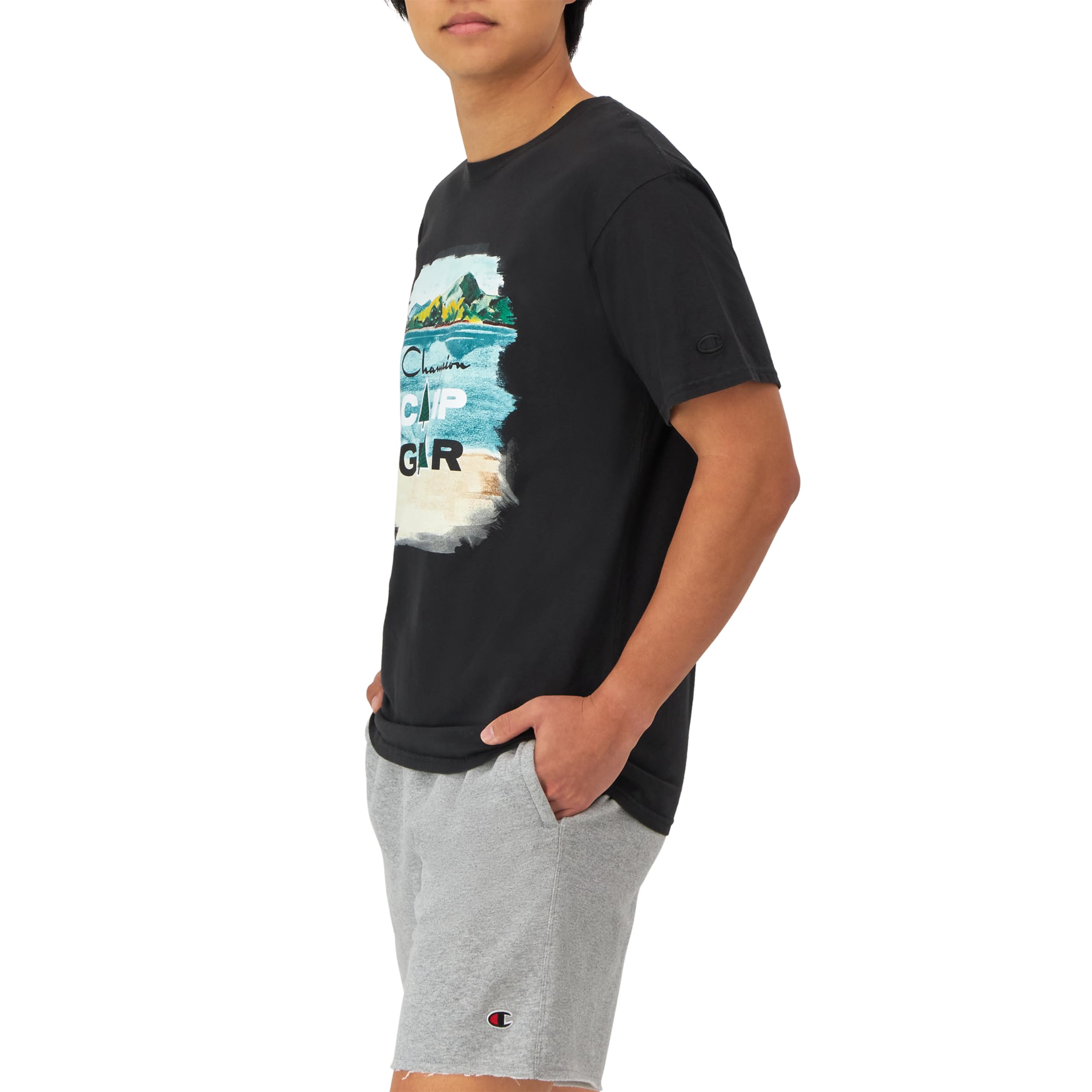 Description WELCOME TO CHAMPION LAND. A postcard-inspired graphic offers a vintage touch to this men's t-shirt. Made from a comfortable, supersoft cotton blend that feels great against the skin, this graphic tee is built to last with a ribbed collar and sturdy stitch work. Because good quality goes with basically anything, pair it with your best Champion jacket for the perfect streetwear look or with joggers for casual days. The iconic C logo hits at the sleeve, sending authentic brand vibes your way.