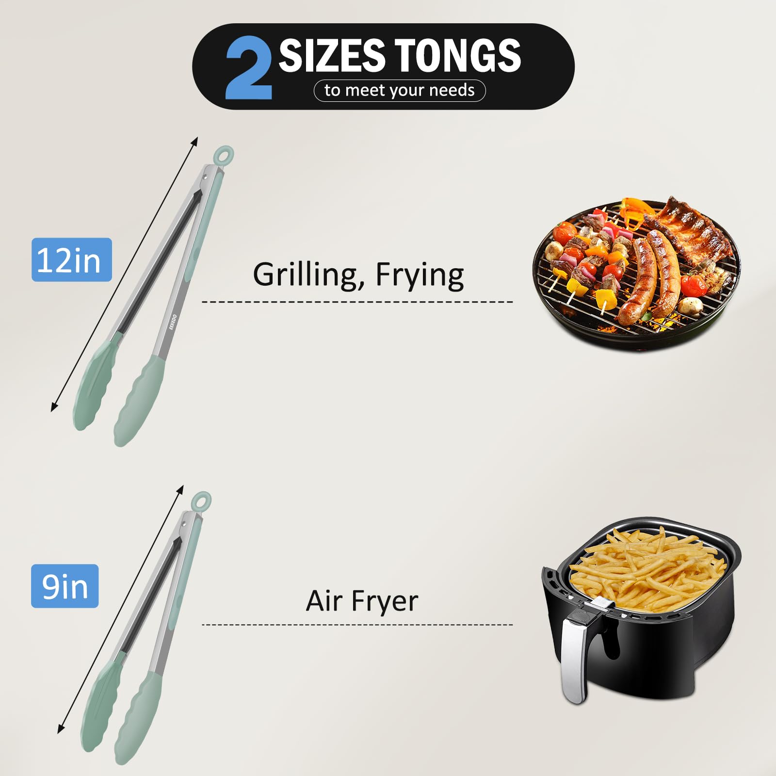 Essential Kitchen Tools: This tongs for cooking comes with 2 sizes, 9 inch and 12 inch. Perfect for your different kitchen tasks, indoor or outdoor use, grilling, flipping burgers/fish, cutting roast meat, pick up noodles and eggs, or used as BBQ turner or salad serving and much more.