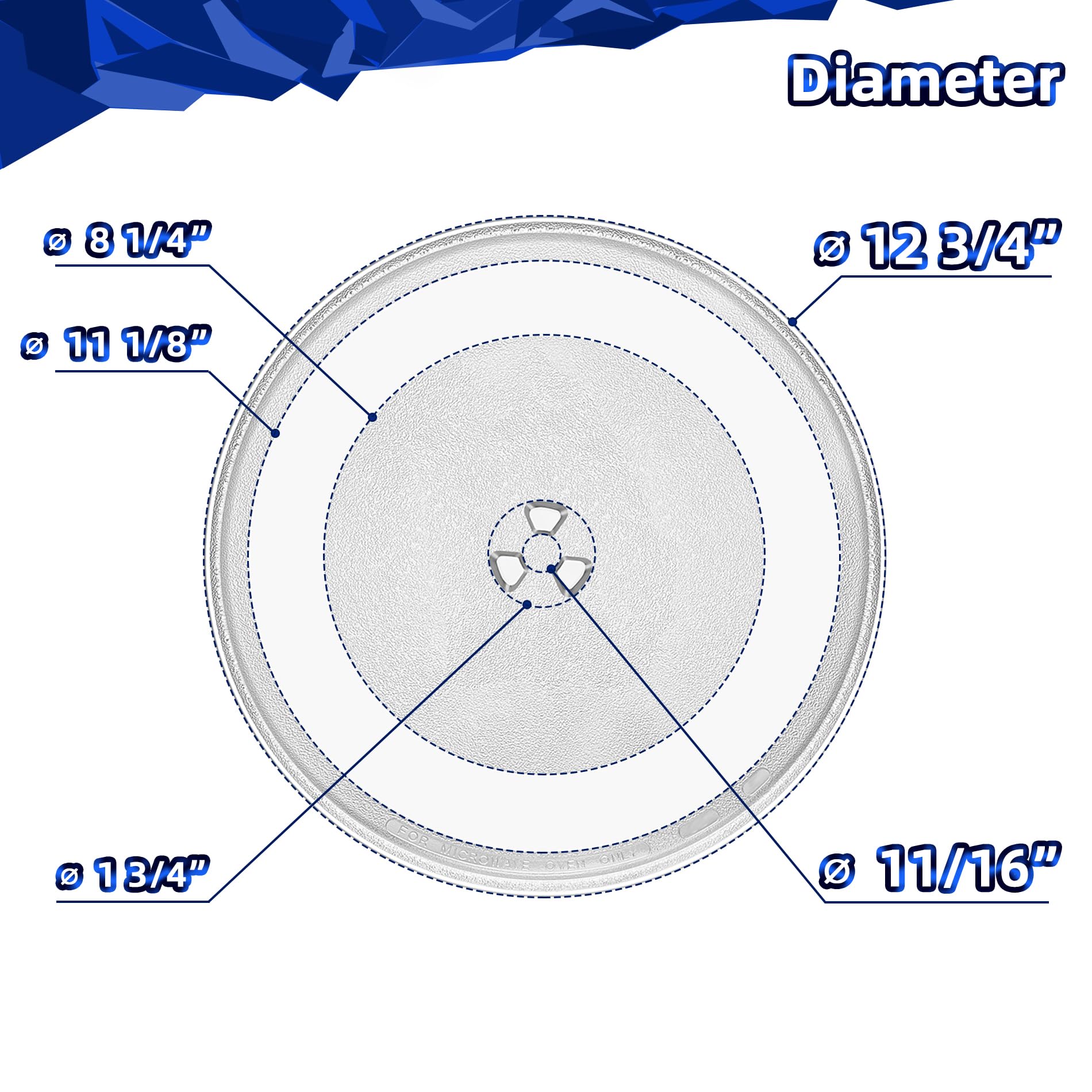 [12.75" MICROWAVE GLASS PLATE] - This microwave glass turntable plate measures 12 3/4 inches. The alignment of the notches to the bushing coupler is critical to ensuring compatibility. This turntable shall work with a turntable coupler that center spot measures 11/16 inch (the size of a dime) in diameter