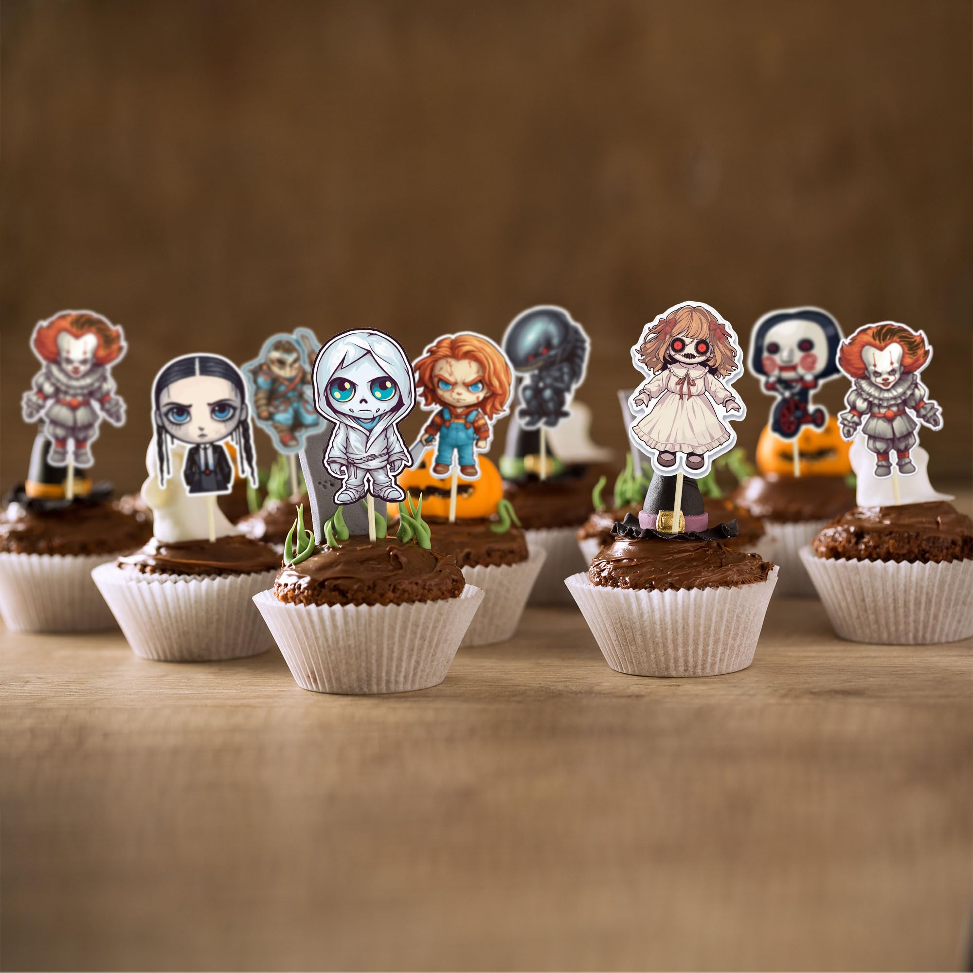 【NO Required】: 36Pcs Horror Classic Movie Cupcake Toppers can put in the cake directly! These 36Pcs Horror Classic Movie Cupcake Toppers saves your time and super easy to use. You can easily dress up your Jungle Safari theme cakes, yes! but don't stop there, put them into desserts, cookies, fruit pieces, appetizers, muffins and so much more!