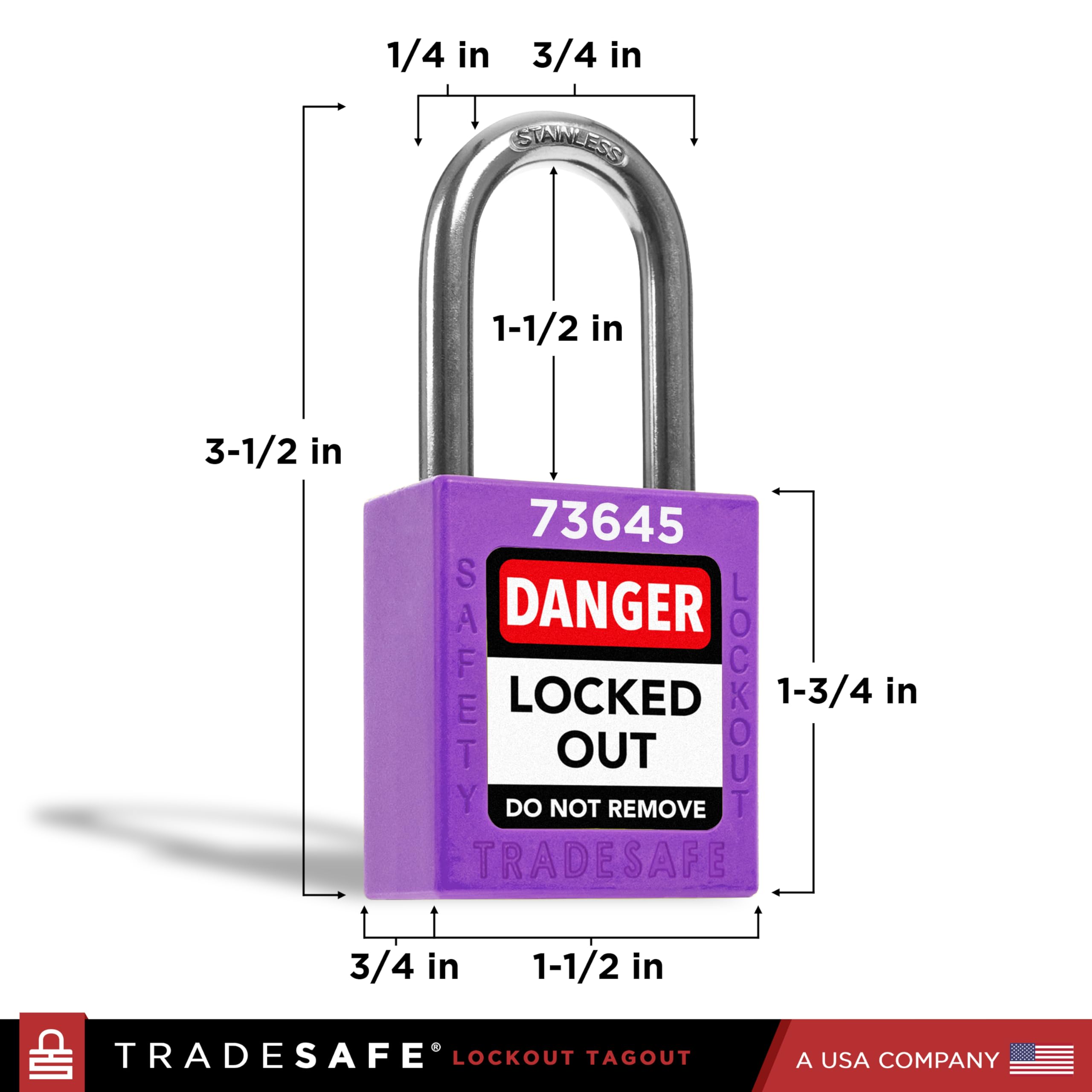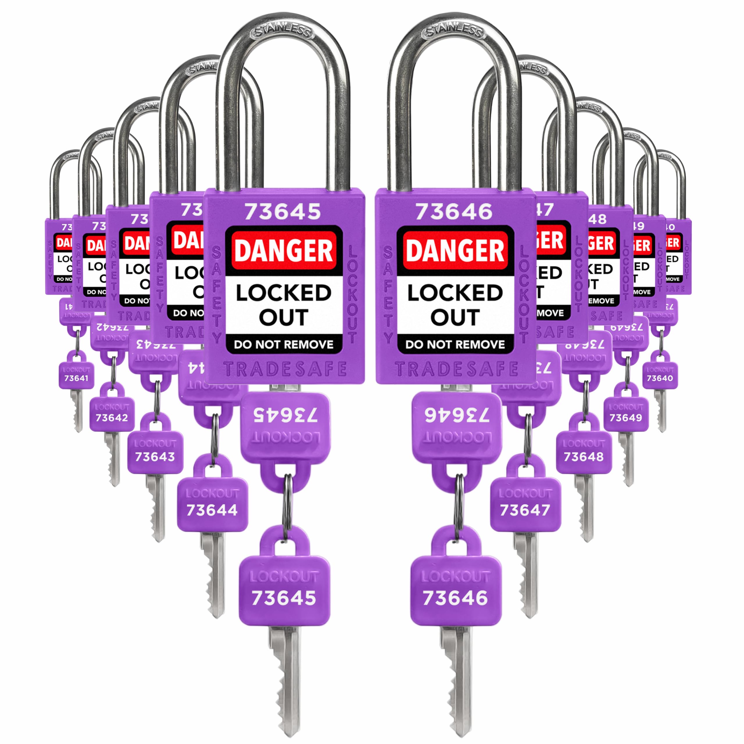 Premium Tagout Lock - (10) Purple lock out tag out locks with 1-1/2 inch long stainless steel shackle, 1/4-inch shackle diameter, 2 keys per lock; matching color and code on padlock body and key bows, each safety lockout lock in the pack has unique numbers
