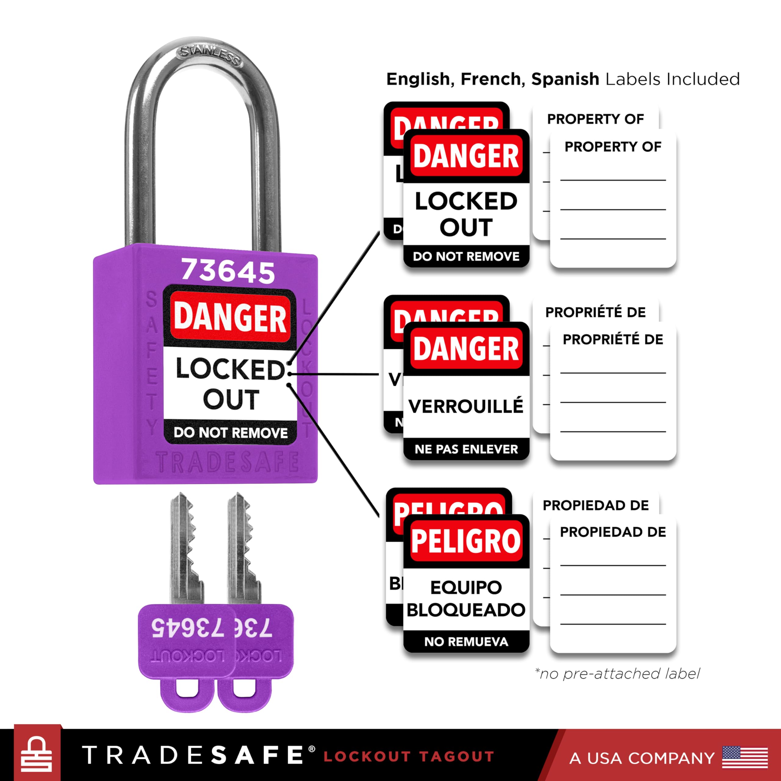 Multilingual Labels - Each Lockout Tagout Lock Set comes with 2 sets of labels in English, Spanish, and French; “Danger Locked Out Do Not Remove” warning label for the front side and a spacious writable label for the back side