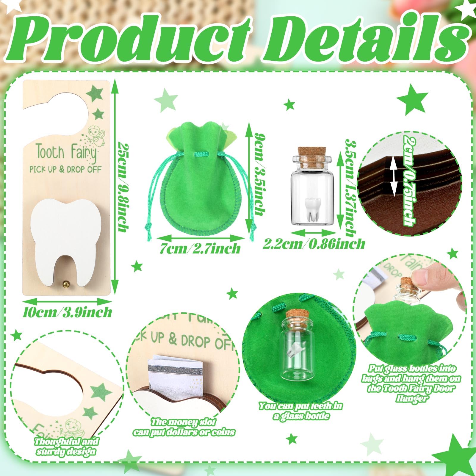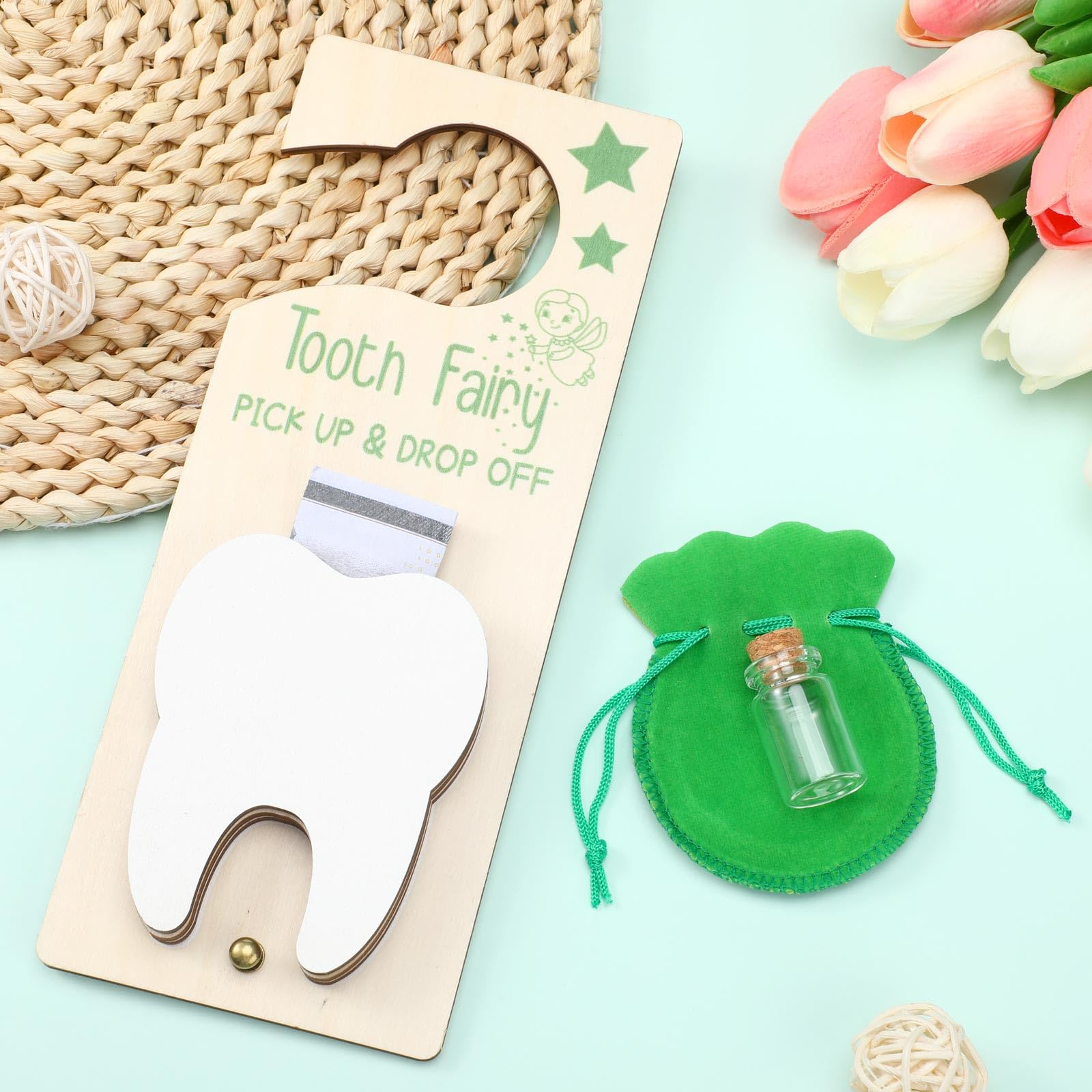 Durable Material Construction: this tooth fairy door hanger is made from wood material, offering durability and strength; The bag is crafted from burlap, offering an exquisite feel while ensuring the safe storage of your child's precious teeth; The bottle is made from glass and features a wooden cork, contributing to the set's overall classic design