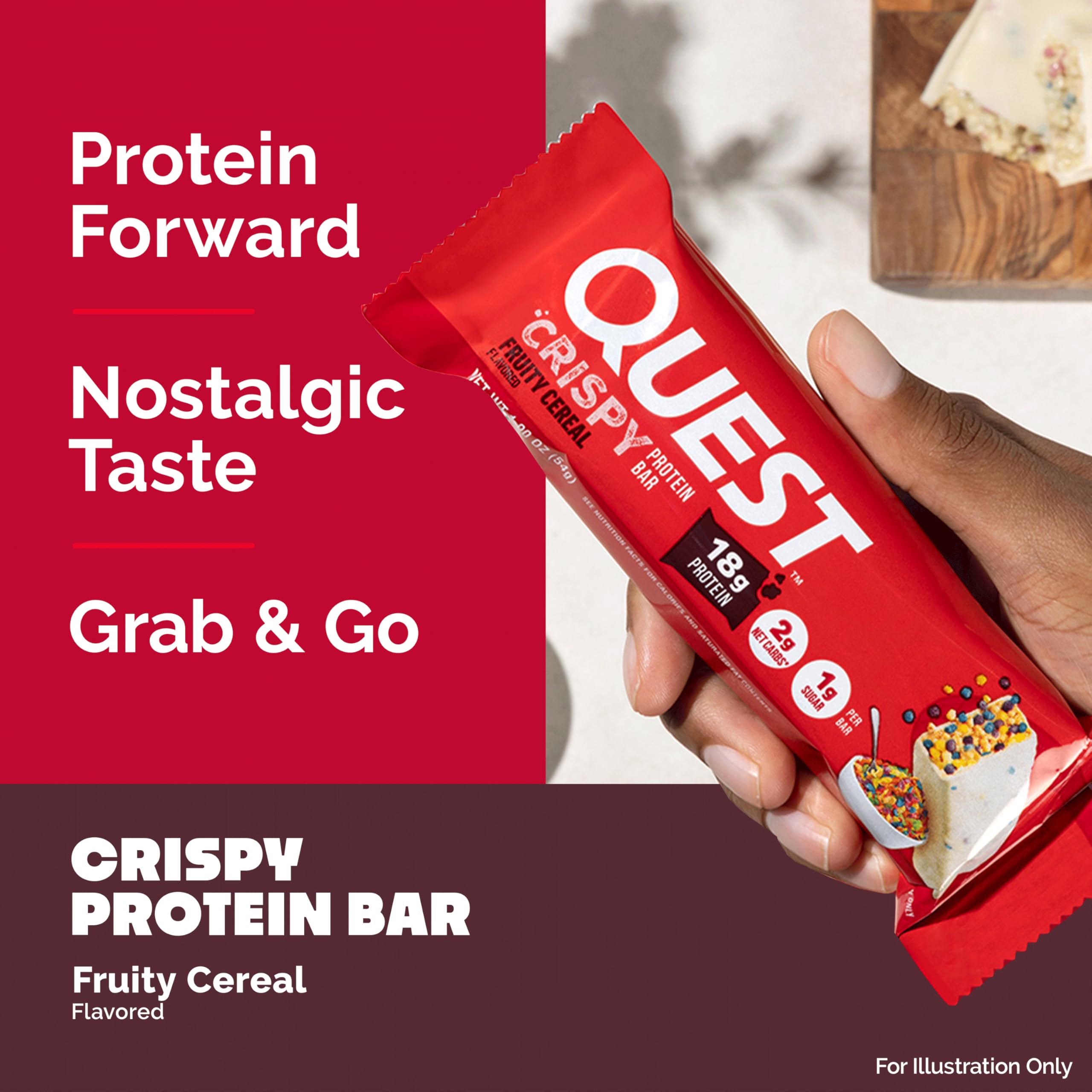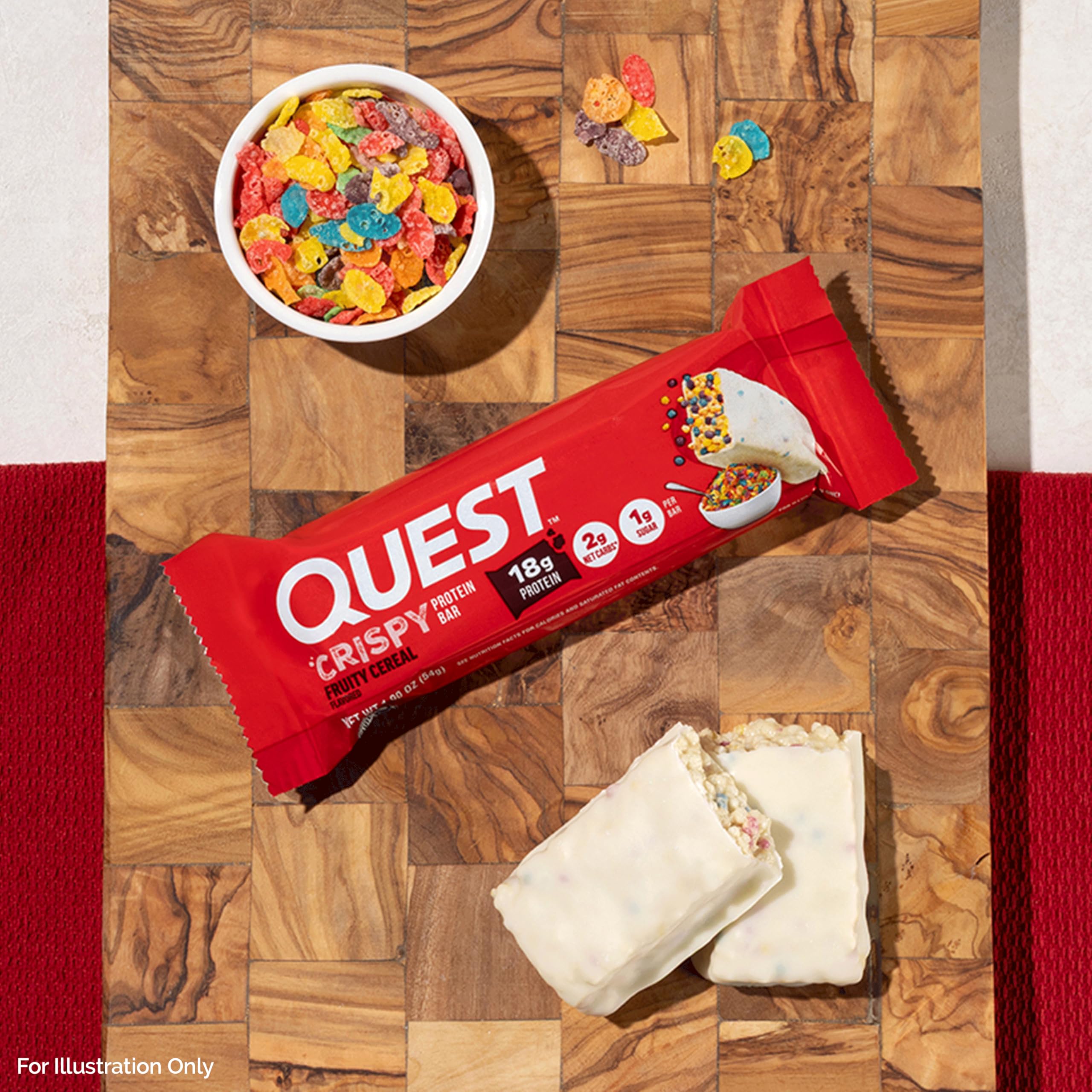 AT HOME OR ON-THE-GO. Quest Crispy Fruity Cereal Flavored Bars with 18g of grab & go protein are just right for your morning commute, as a tasty treat at your desk, or a delicious way to refuel after a workout