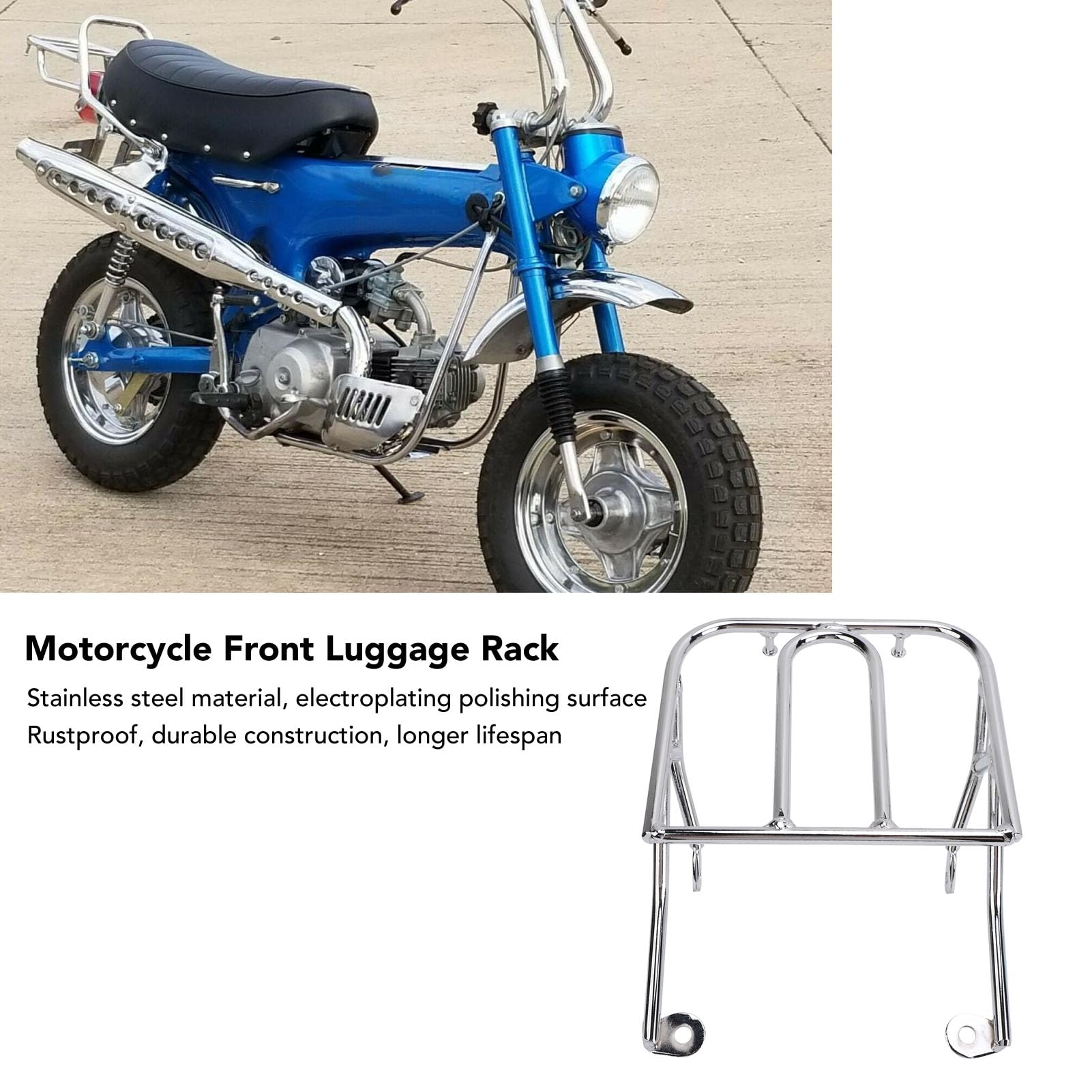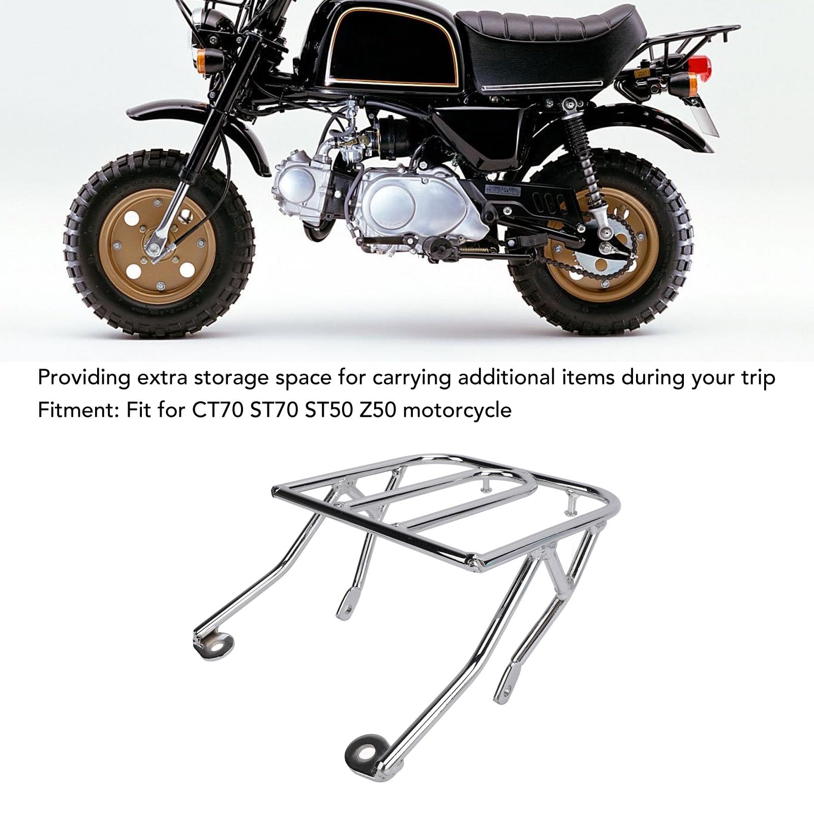 Vehicle Compatibility: Designed specifically for CT70 ST70 ST50 Z50 motorcycles, the motorcycle front luggage rack offers a seamless fit. Please check the motorcycle cargo attachment dimensions carefully before purchase to ensure compatibility with your vehicle.