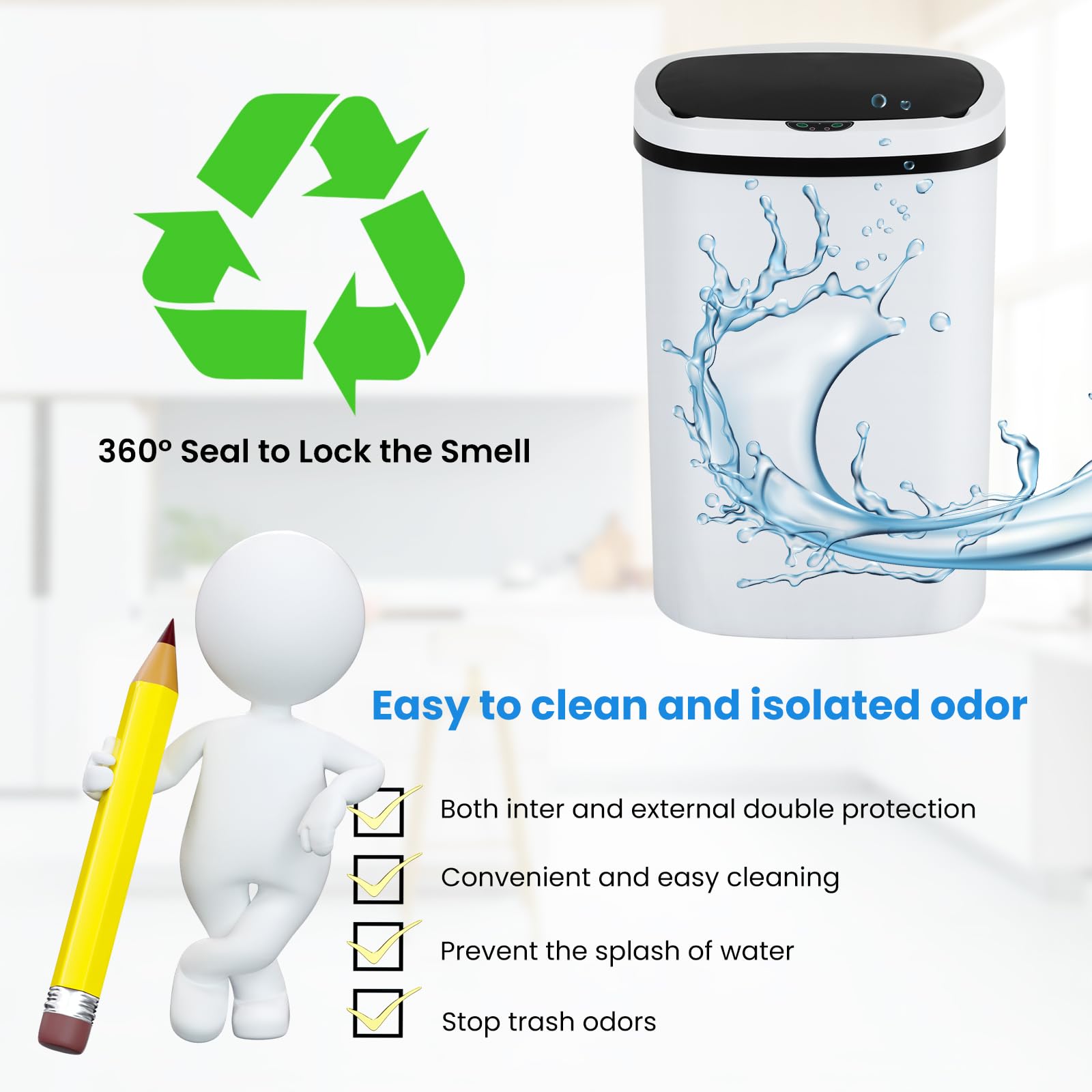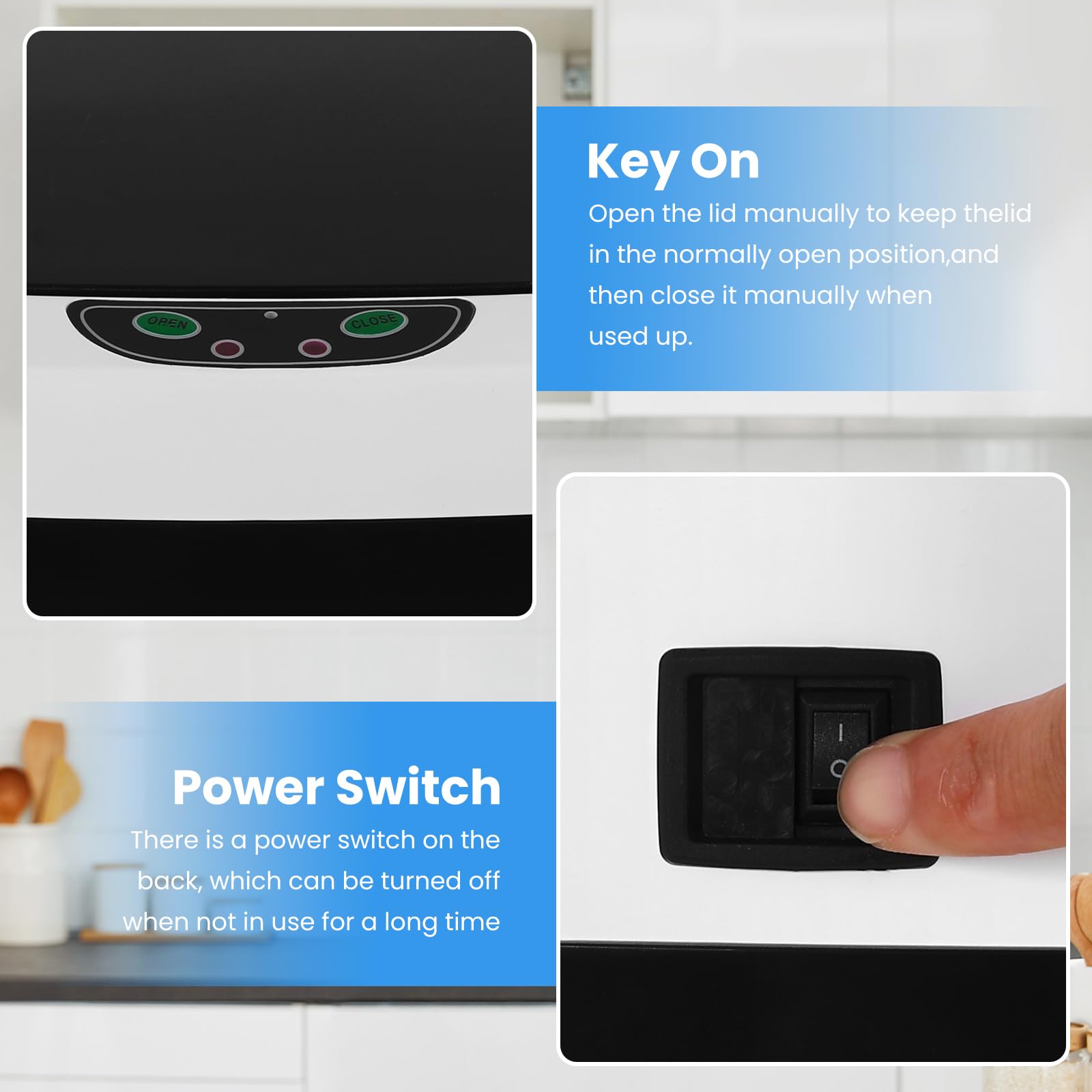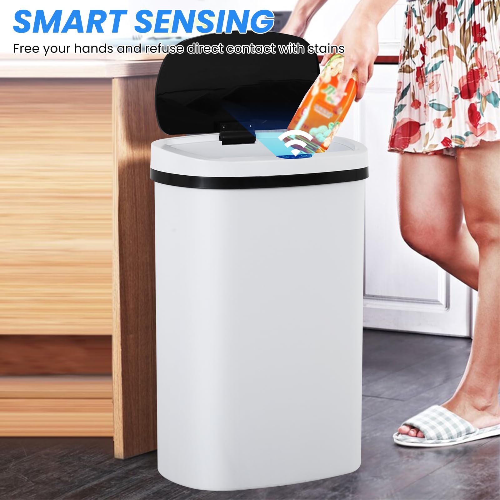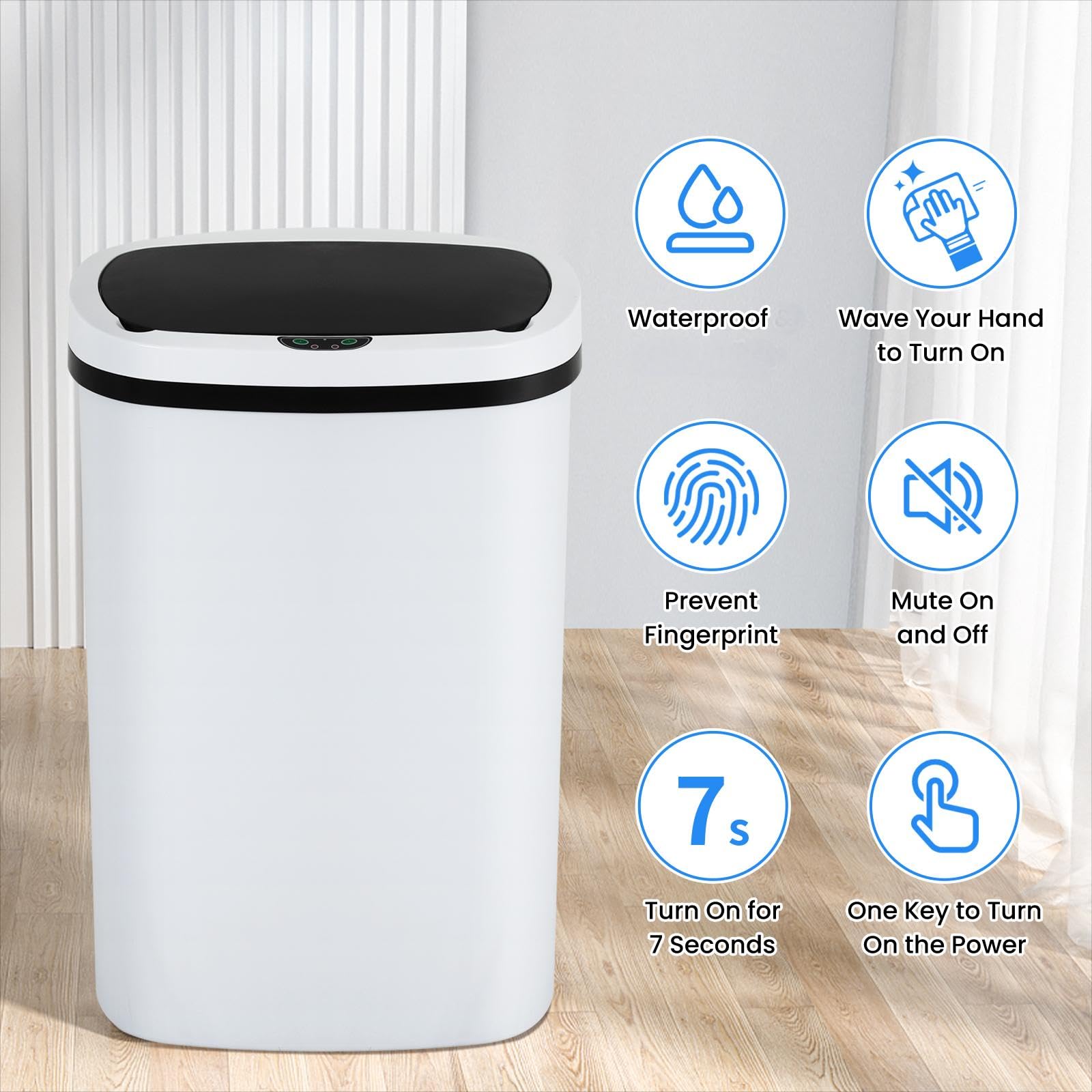 -- No Touch, More Hygienic: -- This automatic trash can is designed to be very user-friendly, you can throw the trash into the can without touching it, very clean and hygienic. This garbage can has an infrared sensor. You can trigger the sensor to open the lid by the proximity range of 6" of the sensor. The response time is about 0.8S. When the lid is opened, it will open for 7S and then close