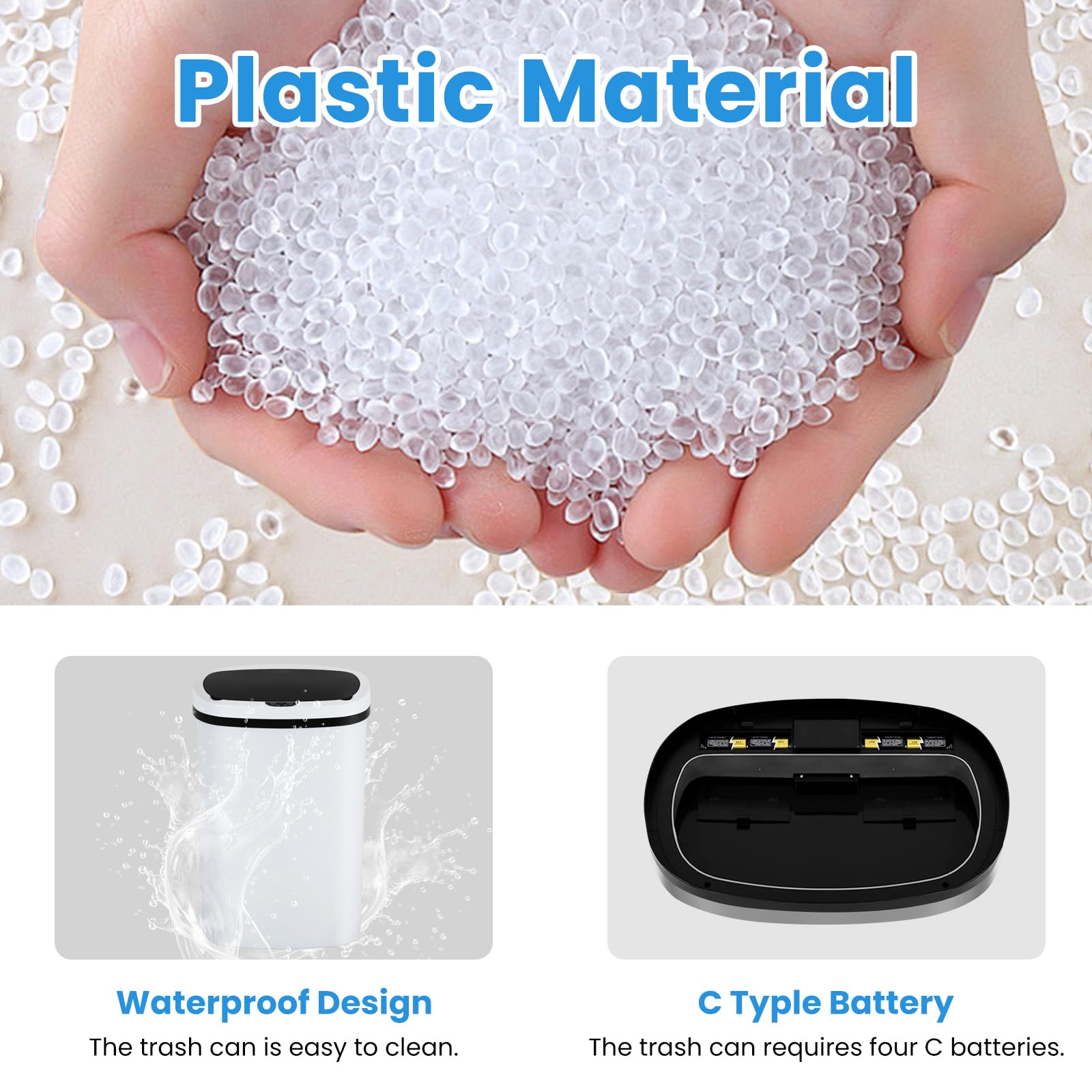 -- Our Trash Can Usage Tips: -- Our trash cans require four C type batteries. There is a power switch on the back of the lid so you can turn off the power when you don't use it for a long time. It can be used anywhere in your home, and of course in your office. We hope this trash can will bring a different experience to your life