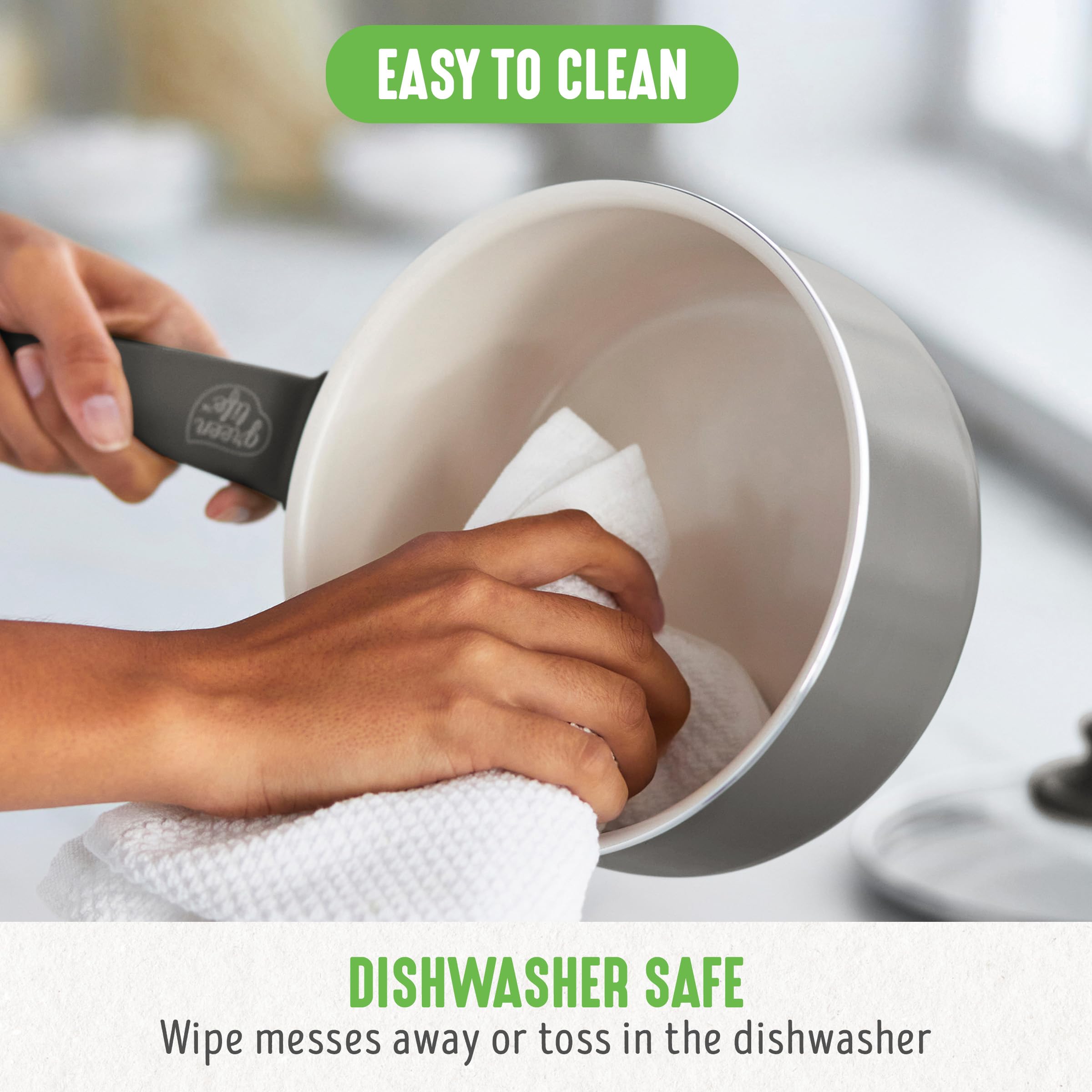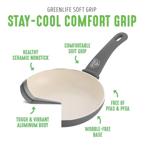 The Soft Grip collection is all about comfort and control. Designed for effortless performance and cleanup, this set features our toxin-free Thermolon nonstick coating, which is free of PFAS, PFOA, lead, and cadmium. GreenLife’s healthy ceramic nonstick is not stuck in the past—that’s why our ceramic nonstick starts with sand and creates 60% less CO2 emissions during the curing phase than traditional coatings. The pans are also crafted with recycled aluminum, because we want your kids’s kids to cook healthy, too. Finished in vibrant colors, this set is outfitted with stay-cool handles to keep your cooking comfortable. Durable glass lids for a good look at any meal in progress without sacrificing heat. For all stovetops, except induction. Oven safe to 350°F. Dishwasher safe. This cookware set includes: 4-inch mini frypan, 7-inch and 9.5-inch open frypans, 1-quart and 2-quart covered sauce pans, 5-quart covered stockpot, 2.5-quart covered sauté pan, stainless steel steamer, and 4 kitchen utensils.