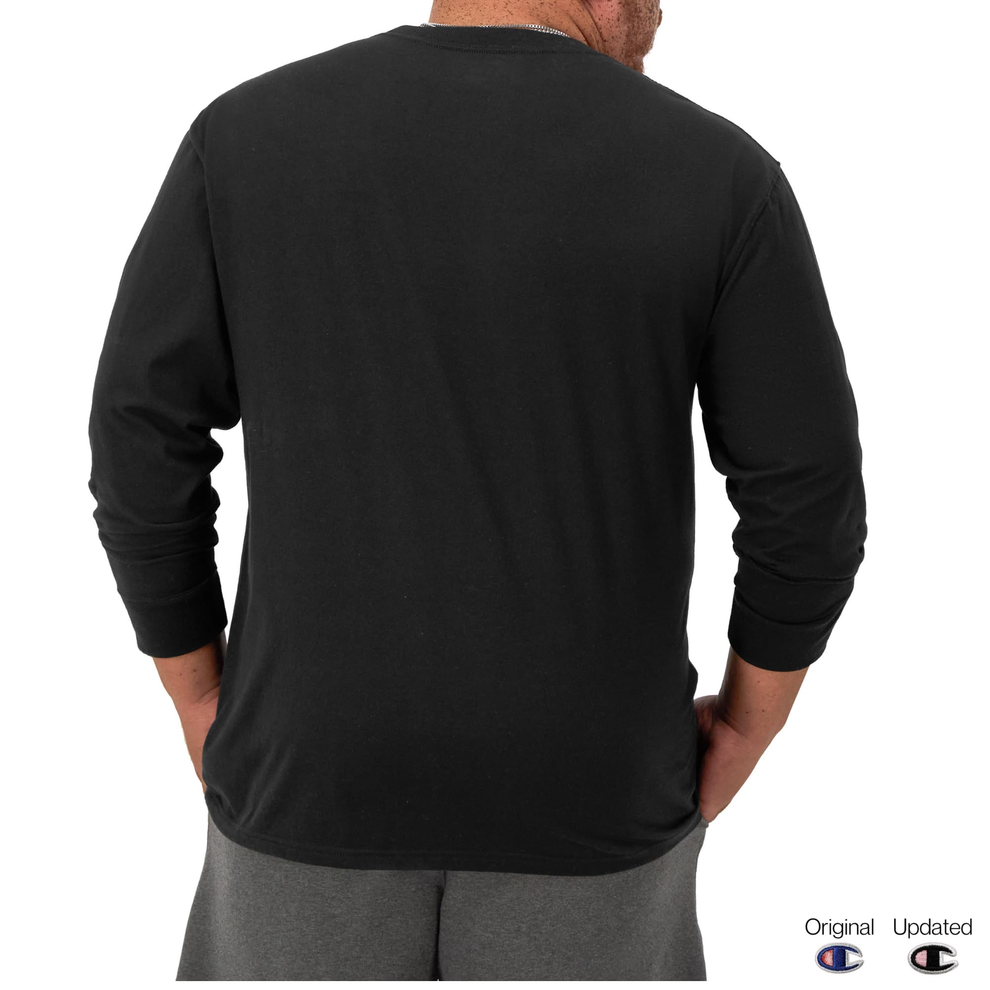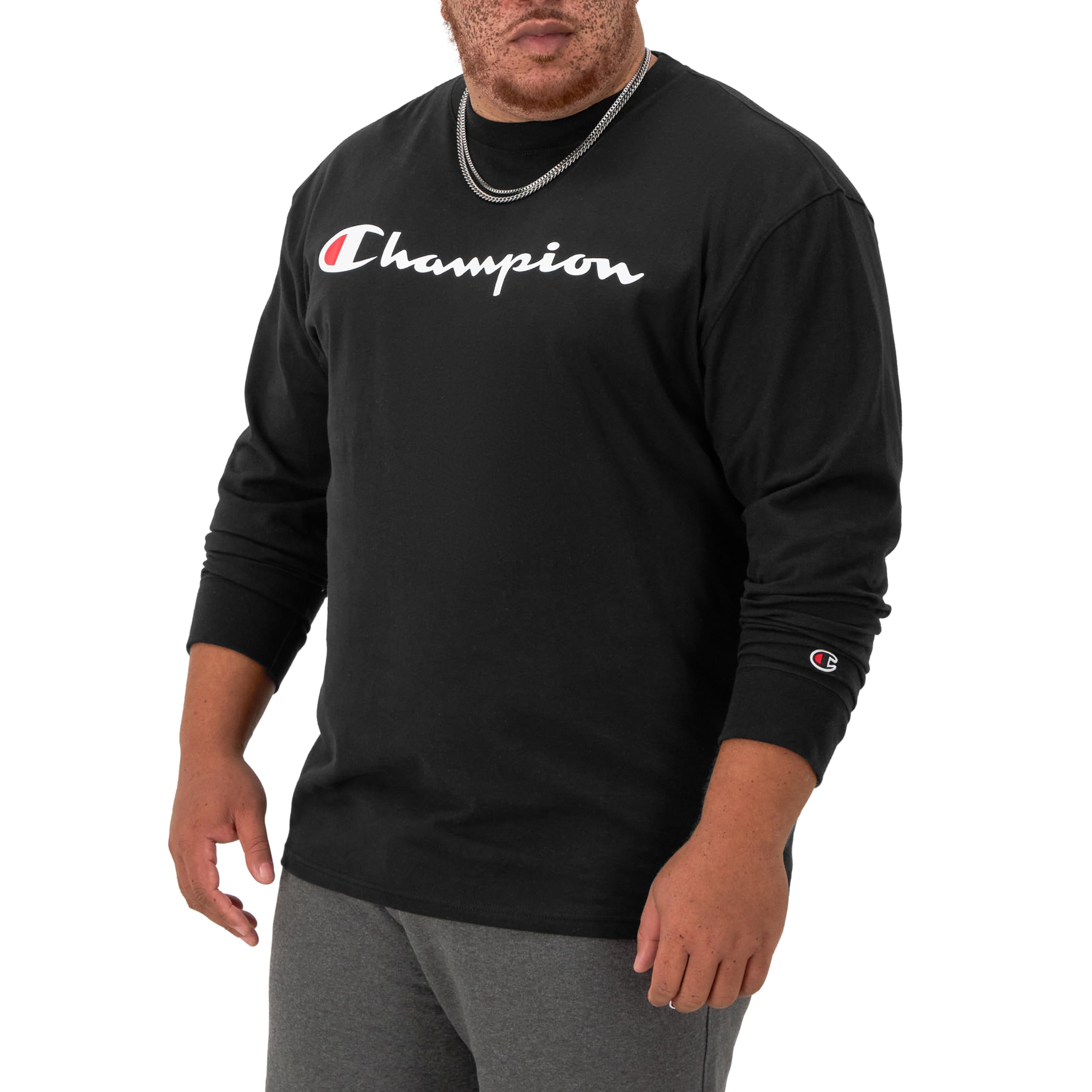 Description A STAPLE FOR ALL SEASONS. A good-to-go long-sleeve shirt is an ideal addition to your year-round wardrobe. Rock this Big & Tall men's long-sleeve T-shirt solo on a breezy night or layer it under your favorite Champion jackets and hoodies for styled warmth. This versatile tee has a soft, worn-in texture you'll love and the cut is made for a Big & Tall frame. The iconic C patch on the chest and sleeve gives that Champion look you trust. From red to black options, there's a look to match your every vibe.