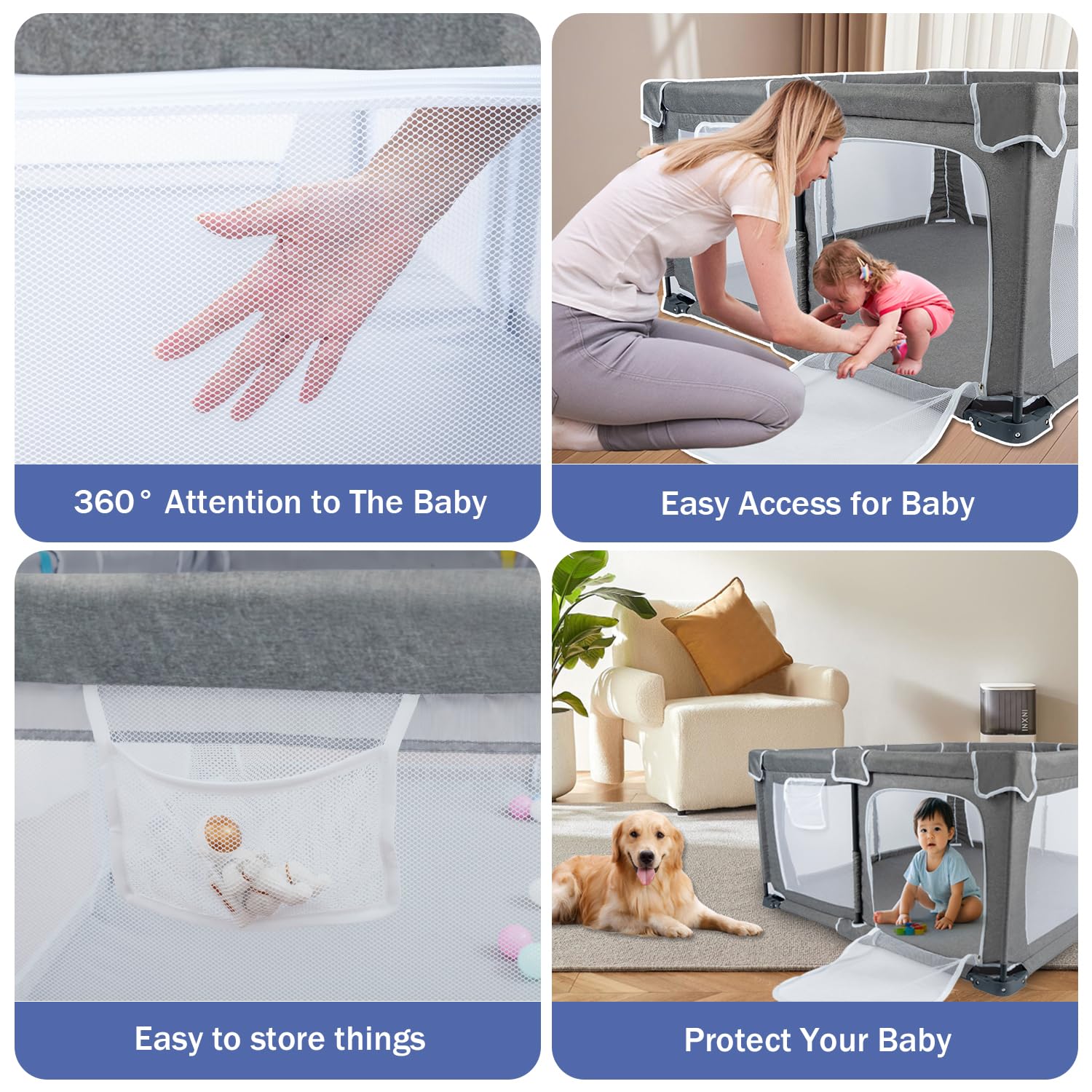 Transparent baby play area: surrounded by ventilated mesh cloth, 360° viewing Angle, wide view. The mother can interact with the baby, give the baby enough security, perfect parent-child interaction. Our products have a zipper door that can be opened on the outside, so that the baby can easily climb out and interact with the parents