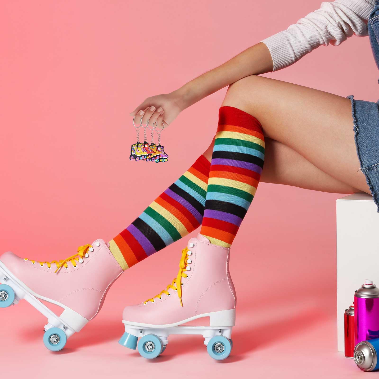 Rainbow Colored Design: the roller skating keychains feature a blend of rainbow colors, decorated with roller skating shoes in varying color schemes and complete with rainbow elements; This playfulness adds a touch of fun and charm to your keys, making it a joyful daily accessory