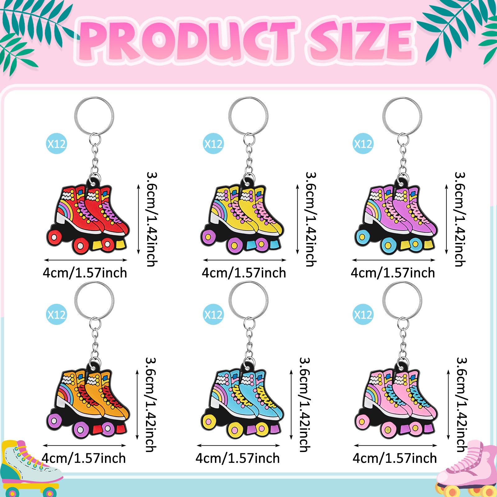 What You Will Receive: you will receive 36 roller skate keychains with 6 colors (purple, yellow, blue, orange, red and pink), 6 of each; You'll have ample to distribute among your family and friends, or use for various decorative needs