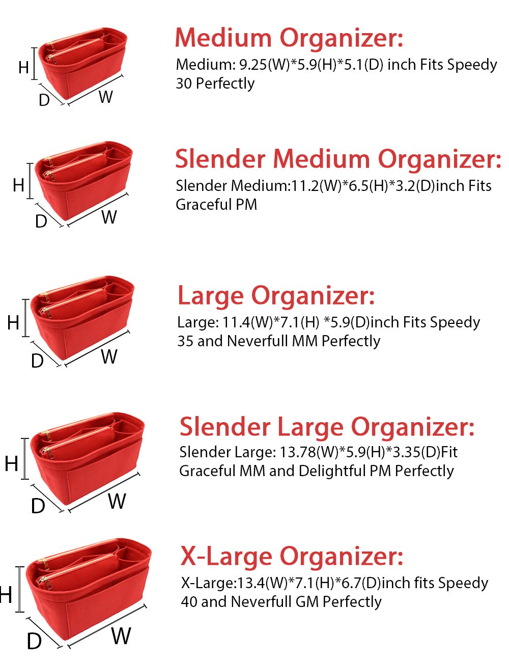 SIZE OF BAG ORGANIZER: Medium: 9.25(L)*5.9(H)*5.1(W) inch Fits Speedy 30 Perfectly. Slender Medium: 11.2(L)*6.5(H)*3.2(W)inch Fits Graceful PM. Large: 11.4(L)*7.1(H) *5.9(W)inch Fits Speedy 35 and Neverfull MM Perfectly. Slender Large: 13.78(L)*5.9(H)*3.35(W)Fit Graceful MM and Delightful PM Perfectly. X-Large:13.4(L)*7.1(H)*6.7(W)inch fits Speedy 40 and Neverfull GM Perfectly. Portable and Compact Purse Perfectly For any Brand.L*H*W means (Length*Height*Width)