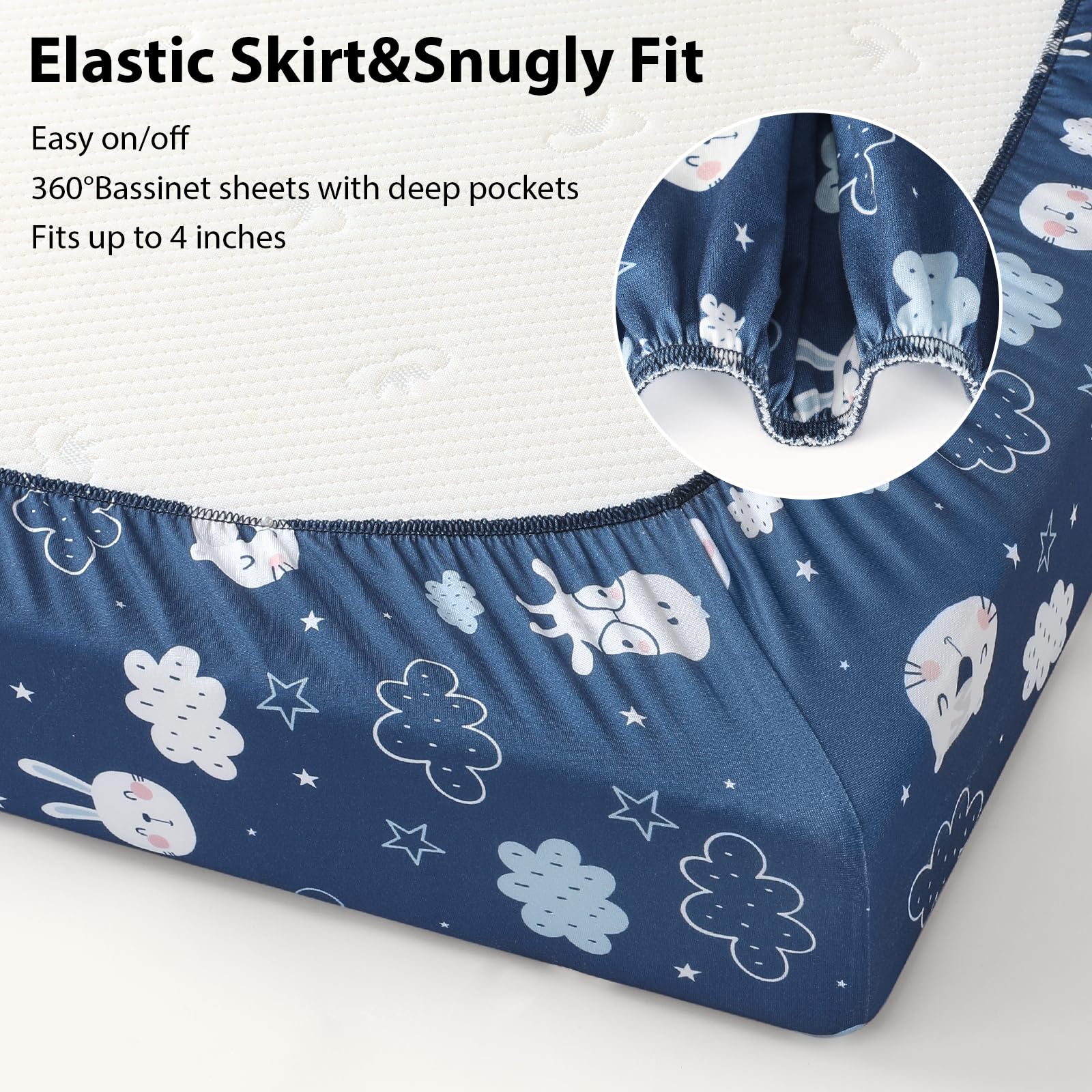 Snug Fit: Measuring 33” x 20”, the 3 pack bassinet fitted sheets fit most bedside sleeper bassinet mattresses. With full elastic edges of the bassinet sheets, a 6-inch deep pocket, and stretchy fabric, they ensure a snug, wrinkle-free fit that stays securely in place, even during your baby’s most active nights.