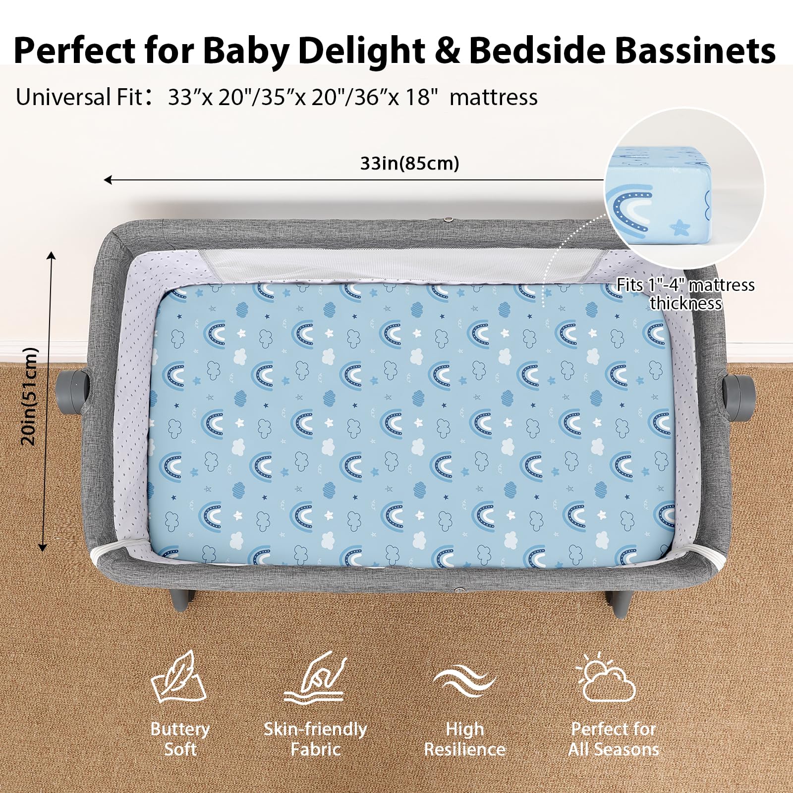 Nursery Essentials: Choose from a variety of bassinet sheets, featuring cute prints and bright colors to bring life to your nursery. You can create a cozy, warm, and harmonious sleep space that nurtures your child’s dreams and growth.