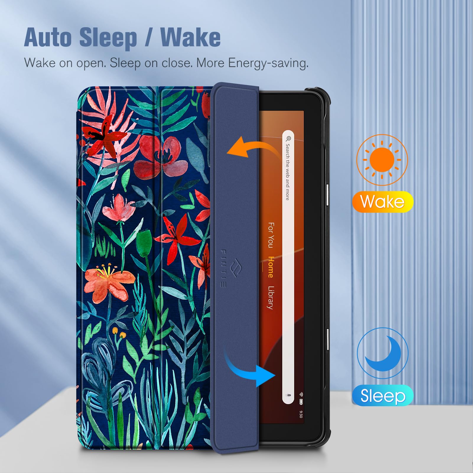 【Auto Wake / Sleep】Built-in magnetic strip provides sleep / wake feature, automatically wakes or puts your 10.1 inch Fire HD 10 2023 tablet to sleep. Magnetic Closure ensures the front cover is securely closed without straps covering the front.