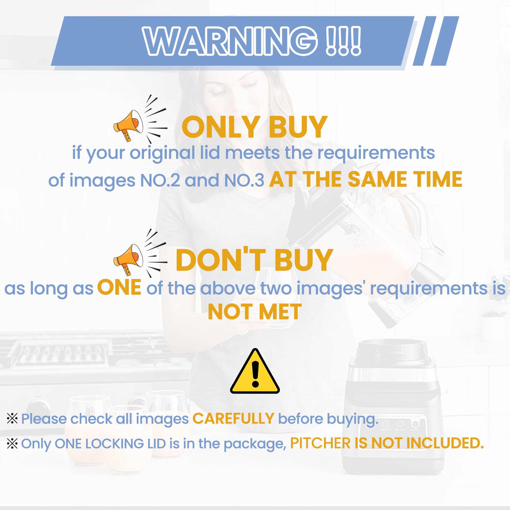 【ADDITIONS】- 1) We DON’T CLAIM our replacement lid for ninja 72oz pitchers is original; 2). Please note that ONLY locking lid is in the package, pitcher is not included; 3) PLEASE CHECK ALL IMAGES CAREFULLY BEFORE BUYING, especially images No.2, No.3 and No.4.
