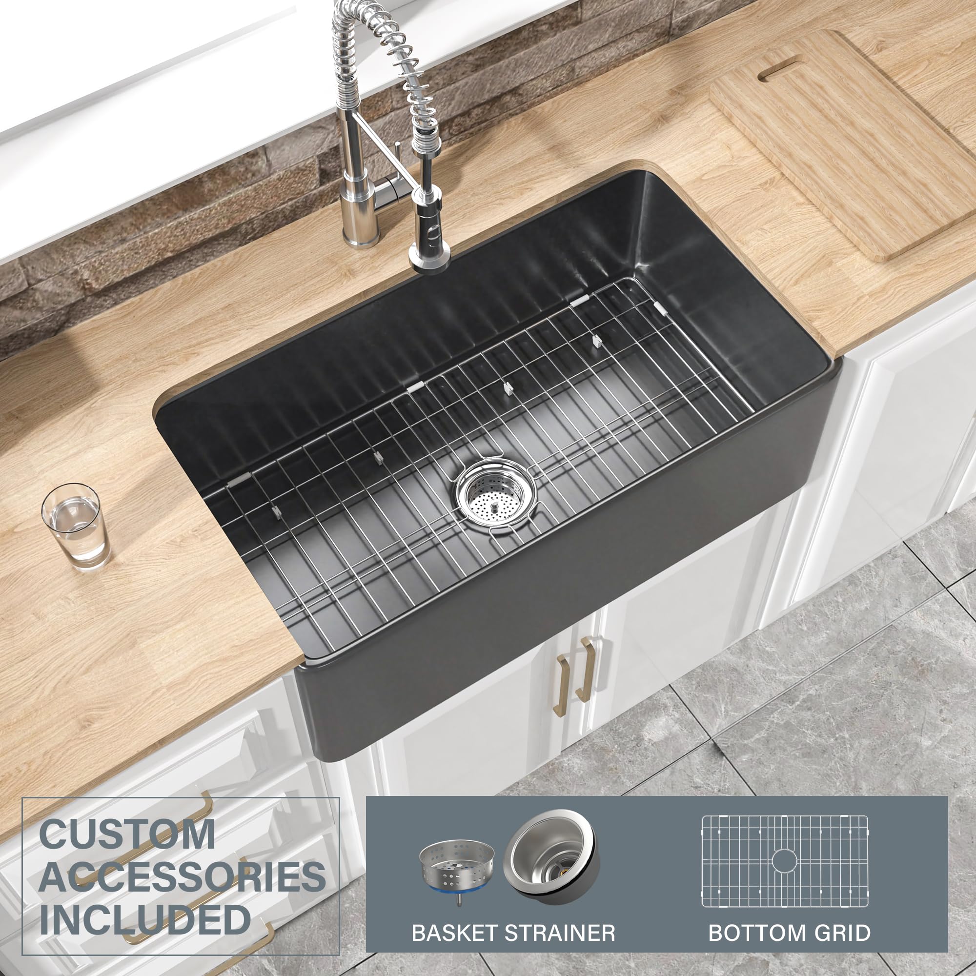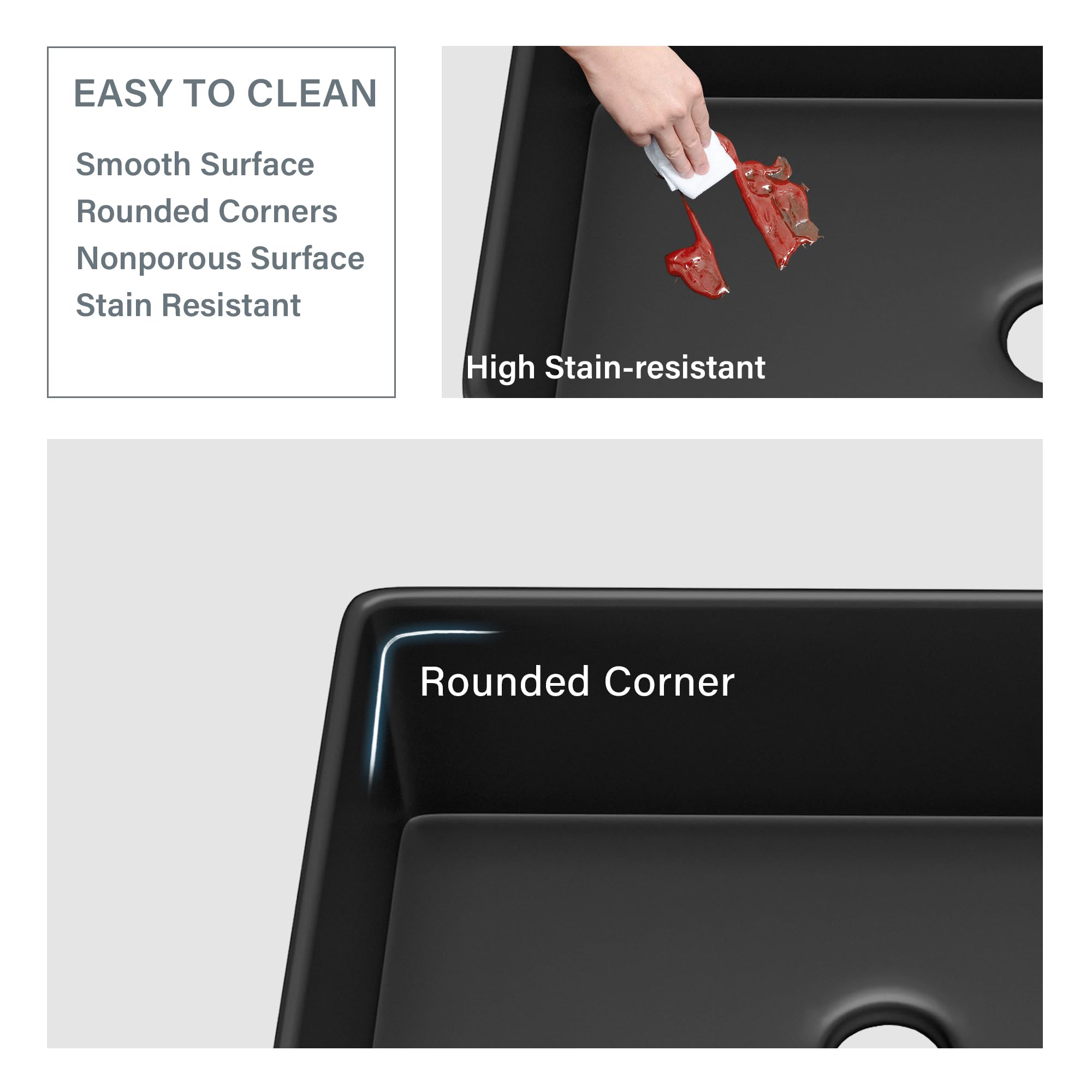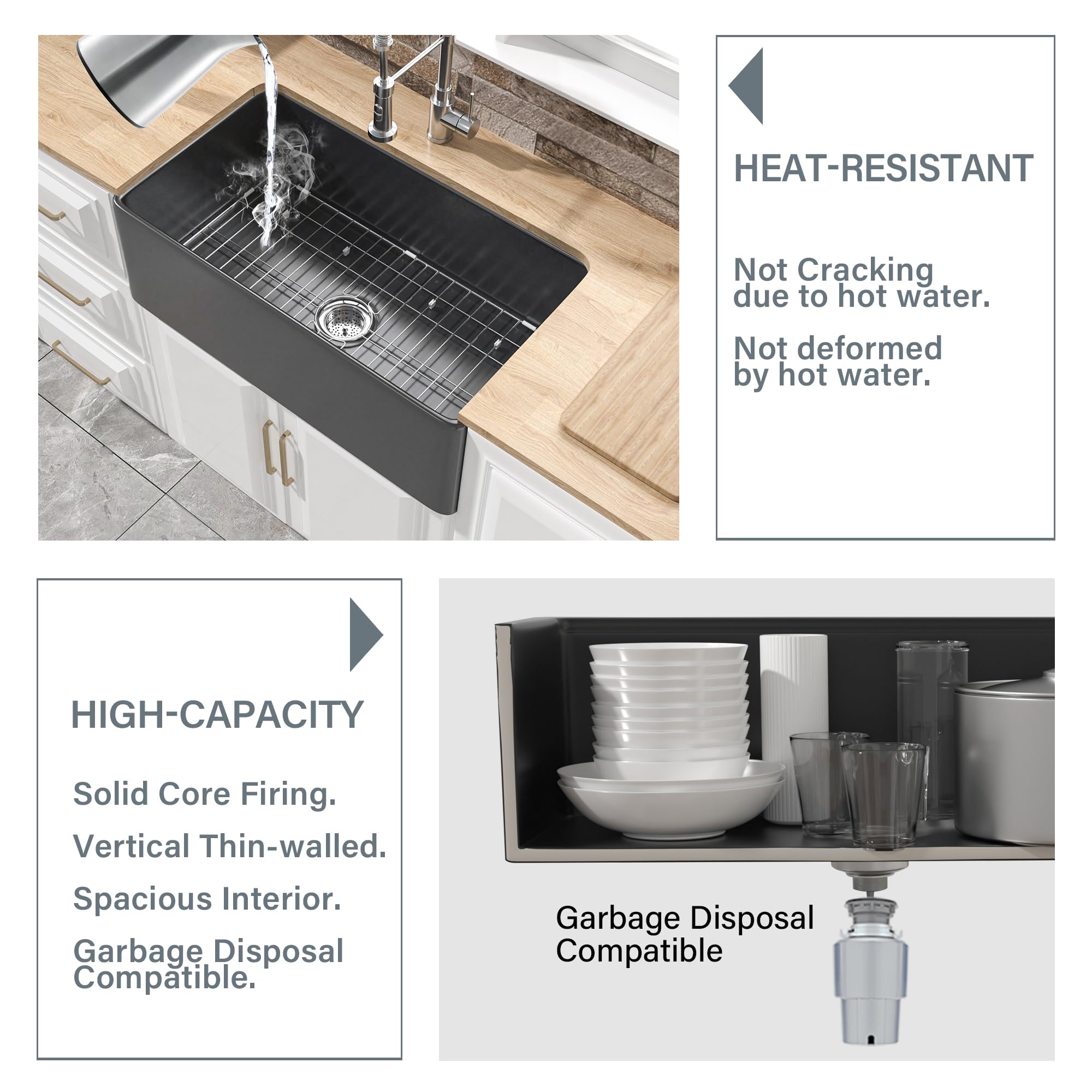 【Matte Black, Non-Yellowing】Ultra-fine glaze in high technology, This farmhouse sink is super glossy and smooth. And the thick porcelain glaze is generously sturdy, which can resist high temperature, scratches, and stains. The sink will not turn yellow after many years.