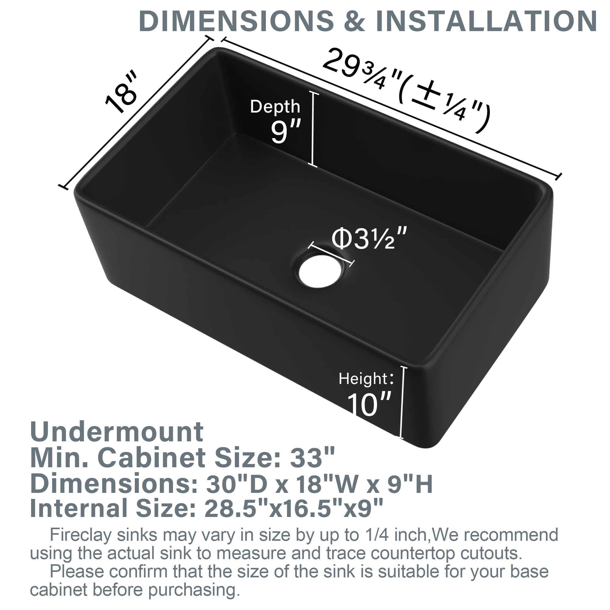 【Installation Requirements】In order to successfully install this black farmhouse sink 30 inch, the minimum size of the cabinet from left to right is 33 inches, the minimum size of the cabinet from front to back is 21 inches. The weight of the fireclay sink is very large. You need to pay attention to the adequate support of the black farm sink.