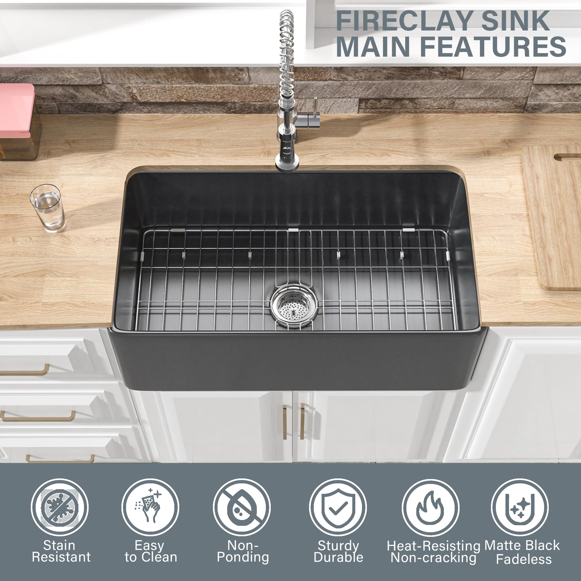 【Sleek Front, Heavy Duty Fireclay Sink for Kitchen】The front of the farmhouse apron sink 30 Inch is smooth, with a black glaze, making the black farm sink look gorgeous and easy to clean.It is a heavy-duty fireclay sink weighing over 60 pounds, It is recommended to have two people move together.