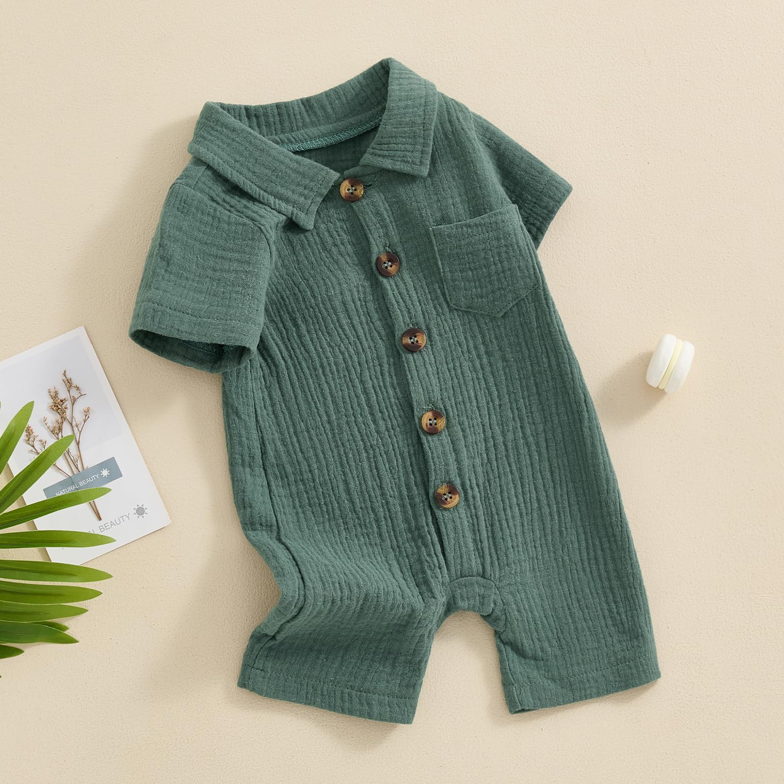Features - Summer baby boy romper jumpsuit, short sleeve, lapel collar, button down, solid color, one chest pockets design, casual cotton linen jumpsuit playsuit for infant boys.