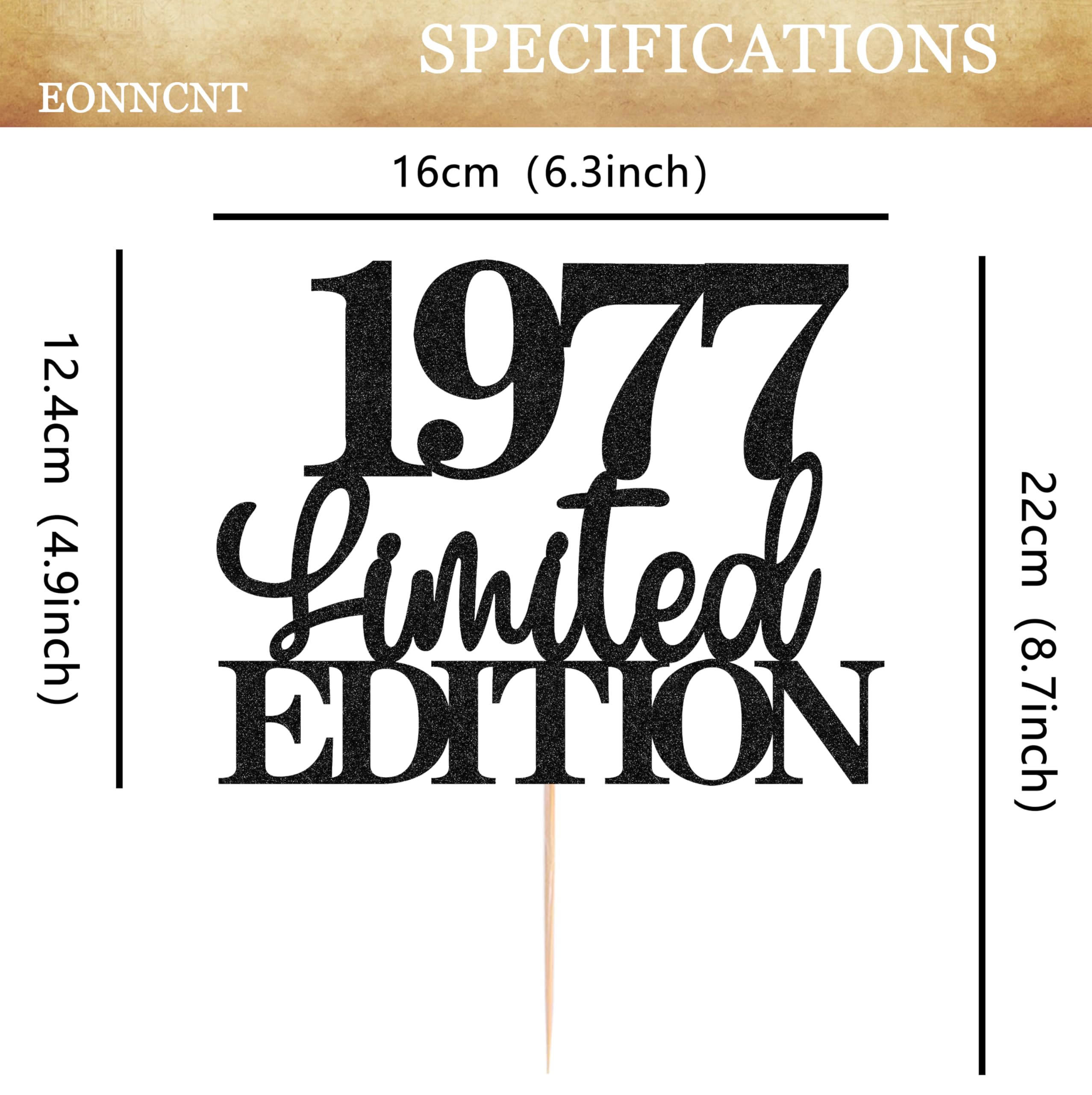 🌹Have you been looking for a decoration that can make your birthday cake instantly dazzling? Do you yearn to find the finishing touch that perfectly embodies the glorious 49 years of history?🌹 [Brand Introduction] 💞EONNENT is a team dedicated to the research and development of party products. Our team hopes that our product can bring you happiness. Let you receive everyone's blessings at your important milestone moment, leaving no regrets💞 [Product Include] 🎈1PCS Limited EDITION 1977 Cake Topper [Core Features and Functions of The Product] ✨Shining Light Function ✨Theme highlighting function [Product Material and Quality] We have chosen high-quality friendly materials to create the Limited EDITION 1977 Cake Topper. This material is lightweight yet very sturdy, not easily deformed or damaged, and can be stably placed on top of cakes. After meticulous processing, the surface is smooth and delicate, ensuring that glitter elements can firmly adhere and will not easily fall off. Under strict quality control, every cake topper meets high standards, so you don't have to worry about any quality issues during the party. It will consistently add luster to your birthday cake and accompany you throughout the unforgettable 49th birthday celebration [Product Design and Appearance] In terms of design, the Limited EDITION 1977 Cake Topper cleverly blends classic and fashionable elements. It is presented in a simple and atmospheric style, with the black "1977" number complementing the sparkling effect, showcasing the solemnity and preciousness of the 49th birthday while retaining the vitality and charm of modern fashion. Its exquisite design and just the right size make it perfect for pairing with multi-layer luxury cakes or simple single-layer cakes, becoming the most attractive decoration on cakes. Its color matching has been carefully blended to harmoniously blend with various birthday party themes, it can naturally blend in and enhance the aesthetic taste of the entire party scene [Product Tips] ‼️ The product is not edible, do not put it in your mouth ‼️ The product is made of cardboard and cannot be cleaned 💞Let's enjoy this beautiful day together without any regrets💞