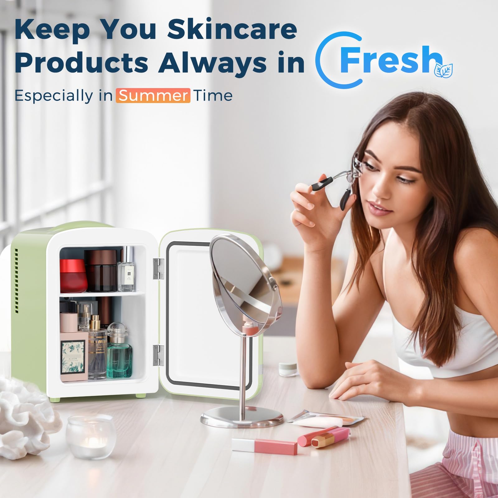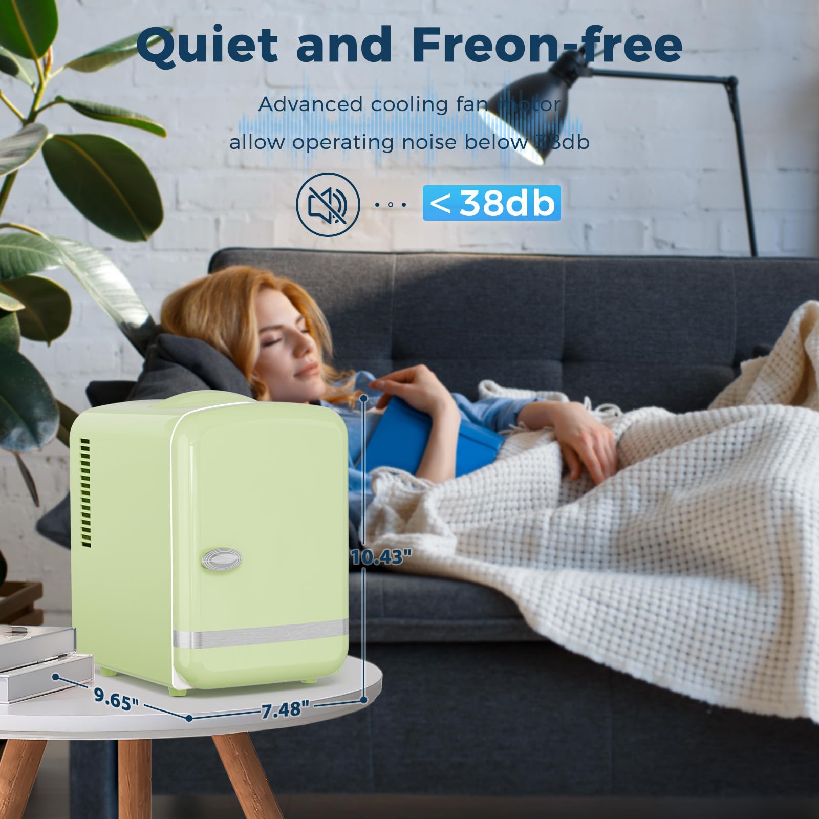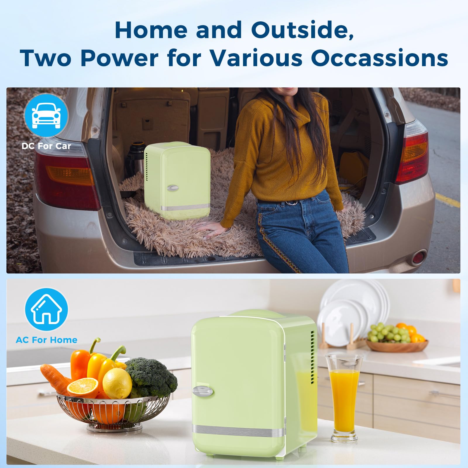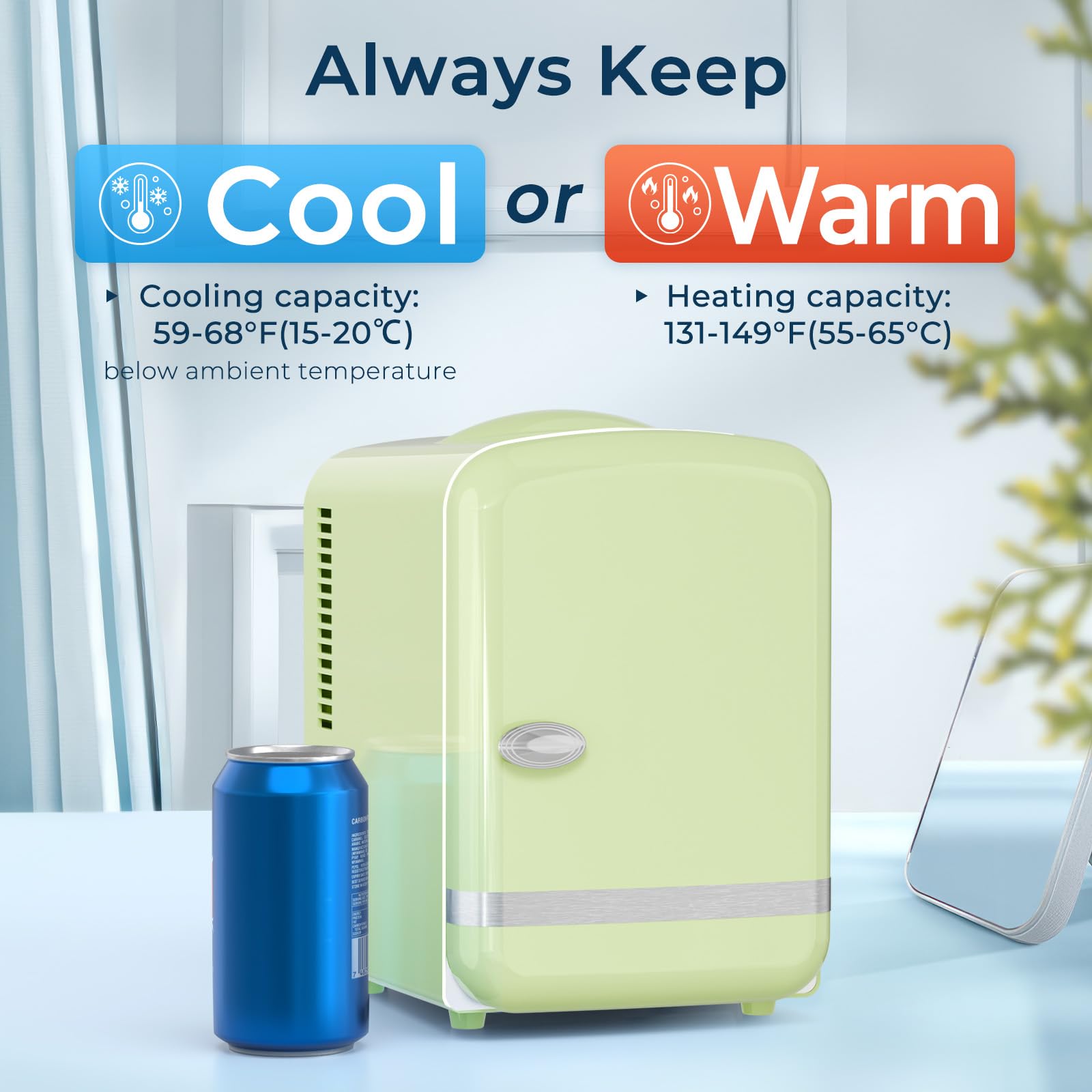 4L CAPACITY: Store 6 can/12 oz with no worry; dimensions are 9.65"D x 7.09"W x 10.24"H; The removable shelf makes the fridge become more flexible to store small items like breast milk, skincare, cosmetic, or food.