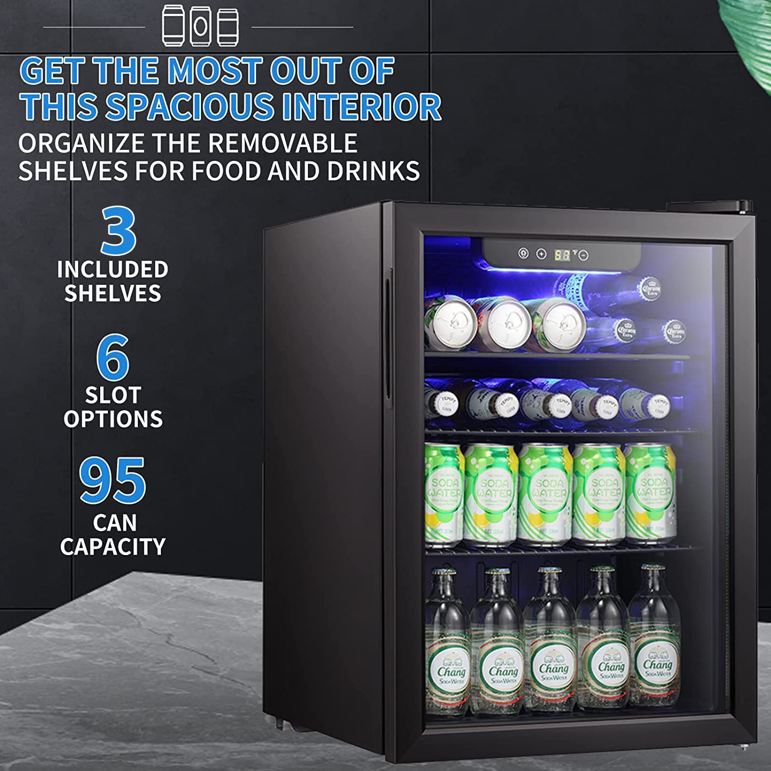 BIG STORAGE:2.6 Cu.Ft capacity that can accommodate up to 95 beverage cans. The shelves are adjustable to allow you to store any bottle design.