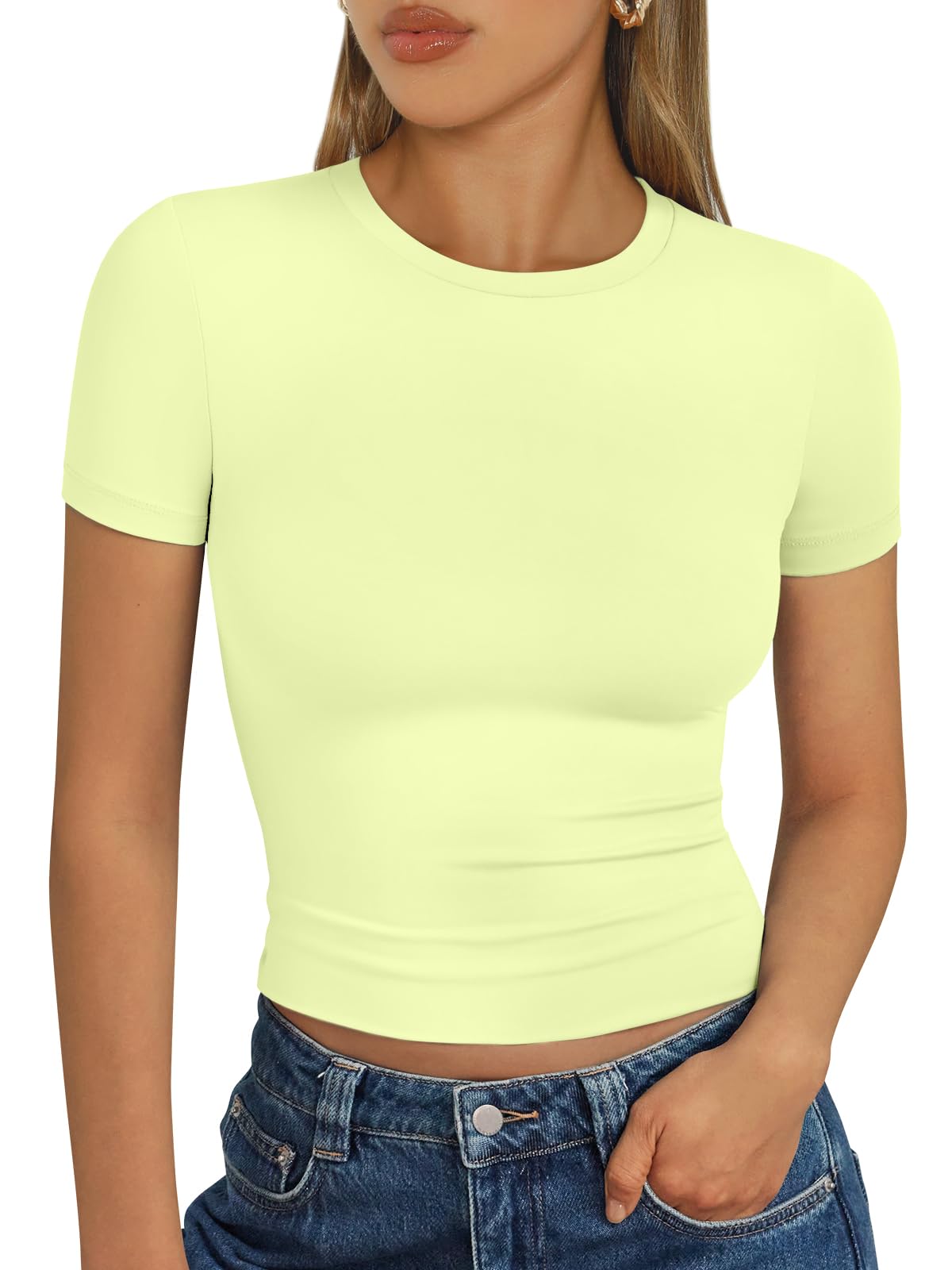 Design: Cropped and regular style,you can wear it regularly or fold it up like a crop top.cute,slim fitted,casual style,scoop neck,short sleeve