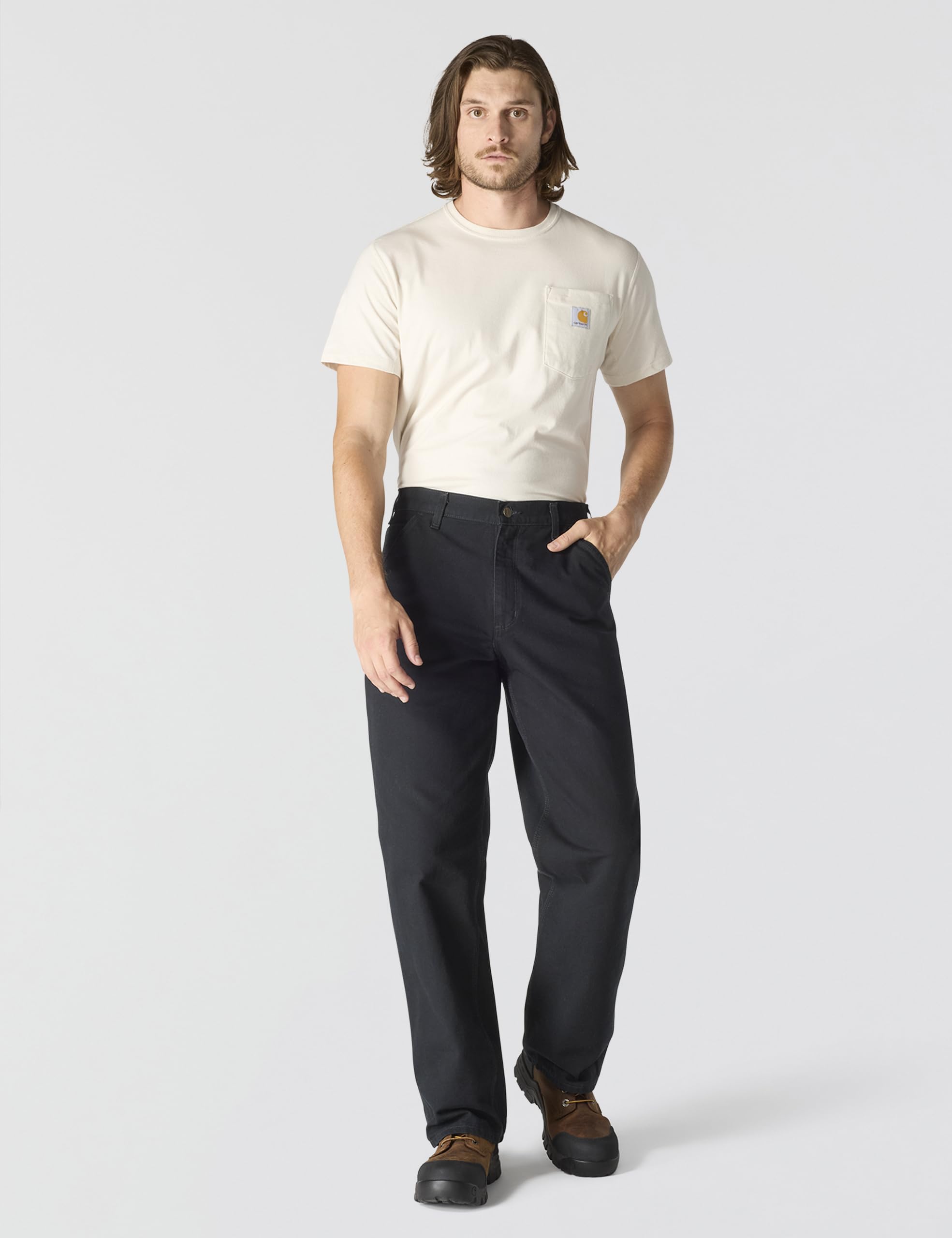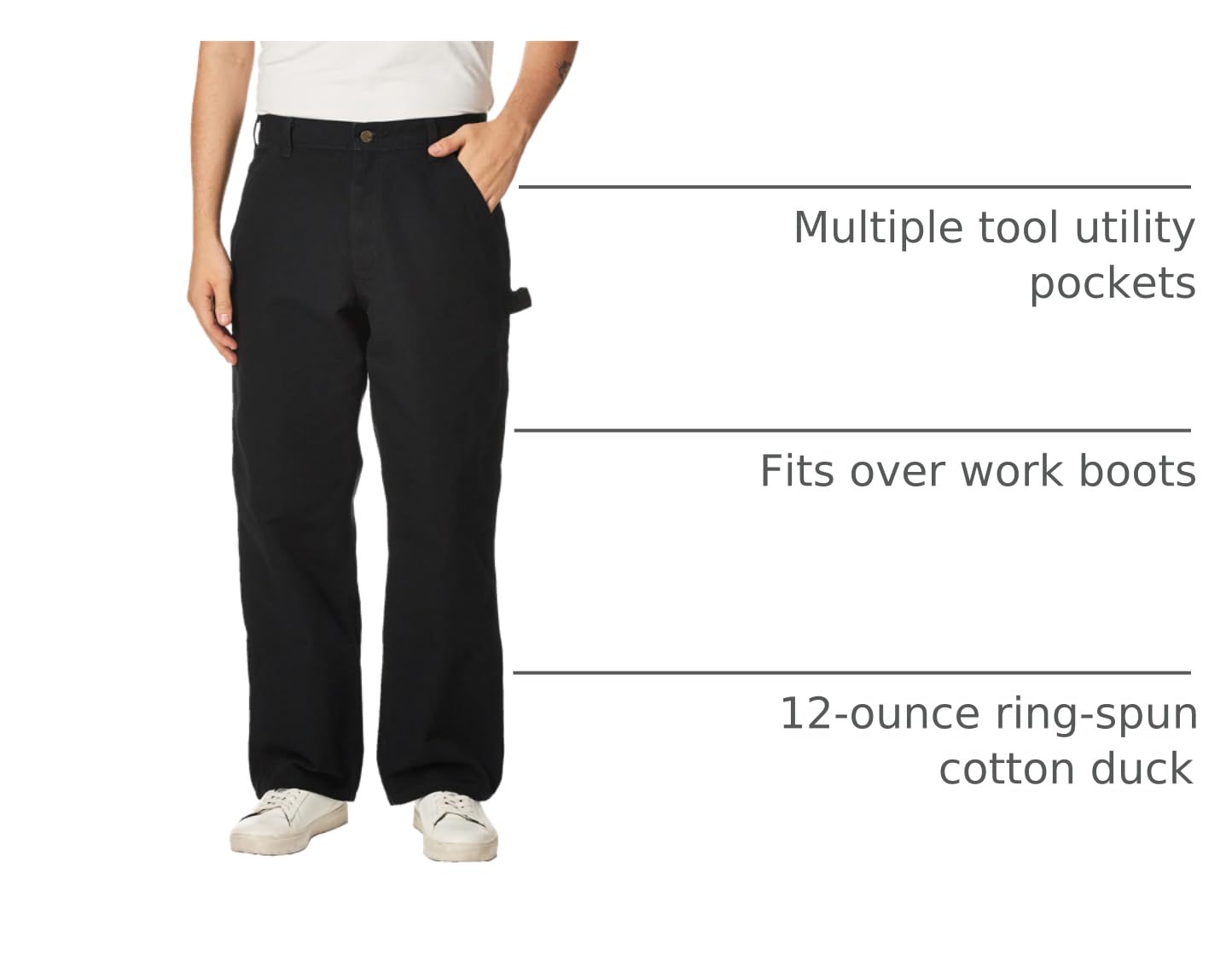 Description Comfortable, practical and long wearing, carhartt's washed duck work dungaree is made of premium 12-ounce, 100% ring-spun cotton duck. There's a full seat and thigh, plus a fit that sits at the natural waist. The dungaree is outfitted with multiple tool and utility pockets plus a hammer loop. The back pockets are reinforced. And, the 19-inch leg openings fit over work boots. field-tested 12-ounce, heavyweight, 100% ring-spun cotton duck sits at the natural waist full seat and thigh . CARE INSTRUCTIONS :For duck pants, do not use bleach. We recommend you machine wash them on the warm cycle, tumble dry on medium heat, and take them out of the machine promptly once dry