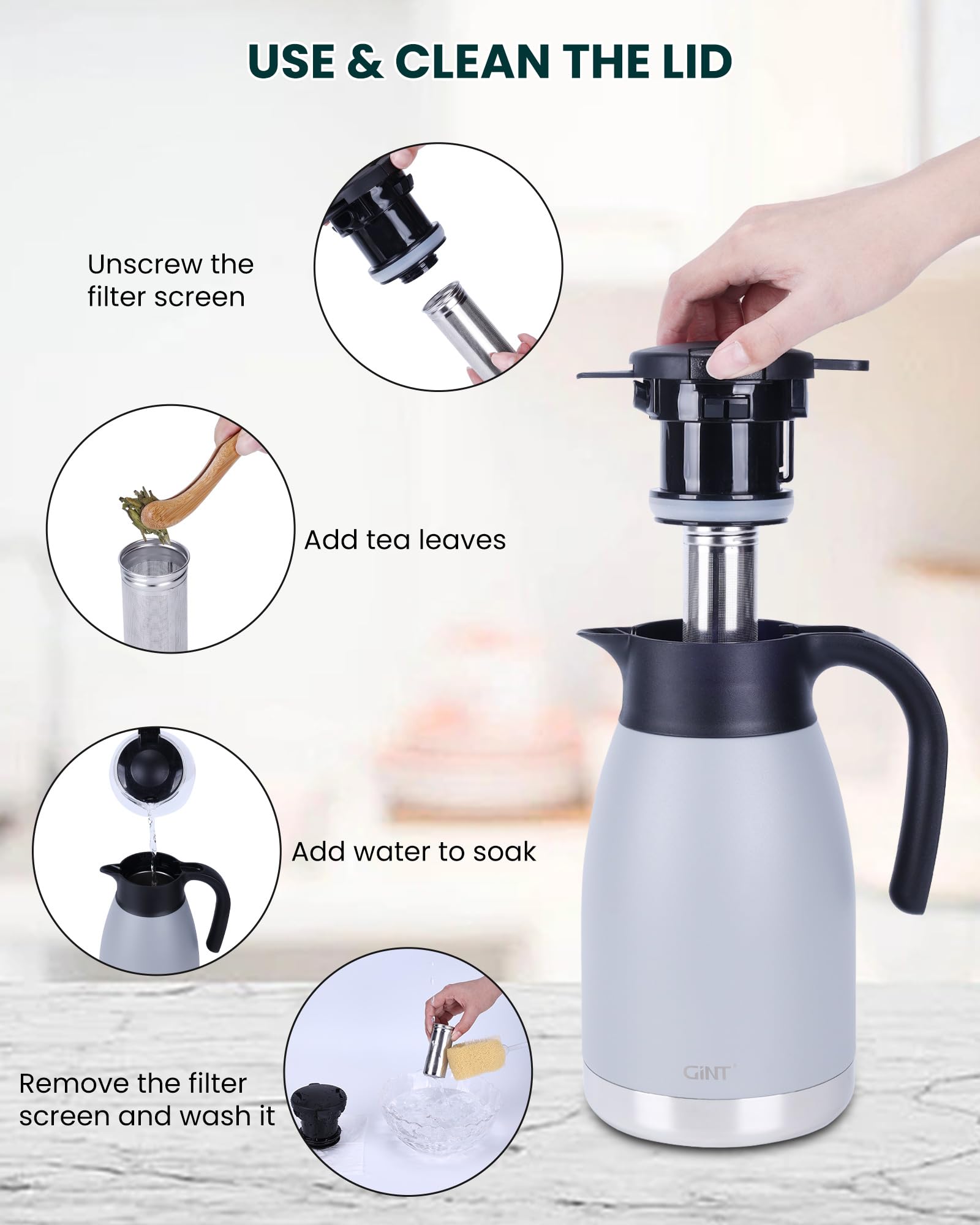 GiNT with its enthusiasm and profession in insulated containers provides food-grade insulation products to every family in the world, to help every user achieve energy-efficient, healthy, convenient and quality life. GiNT thermal coffee carafe can keep your beverage perfect hot (or extremely cool ) until the last sip. Double wall stainless steel ensures strong durability, and disassemble lid convenient for cleaning. We are trying to make the best thermal carafe for your everyday use. Bring us along with you and share your moments with us. GiNT Double-walled stainless steel vacuum insulation keeps your beverage hot up to 12 hours or cold up to 24 hours.Wide-mouth architecture allows even the most distracted users to pour hot or cold liquids without spilling a drop.Dual silicon rings designed with a new insulated and air-tight construction that provide leak-proof and temperature preservation. GiNT with the lid of the thermal carafe can be opened easily with two fingers.When closed, place the cap on the top of the bottle and press it down. The operation of adding water is simple and convenient.The thermal coffee carafe with detachable design helps you restore the sparkling shine on the inside and makes it easy to clean up the interior of the lid after use.