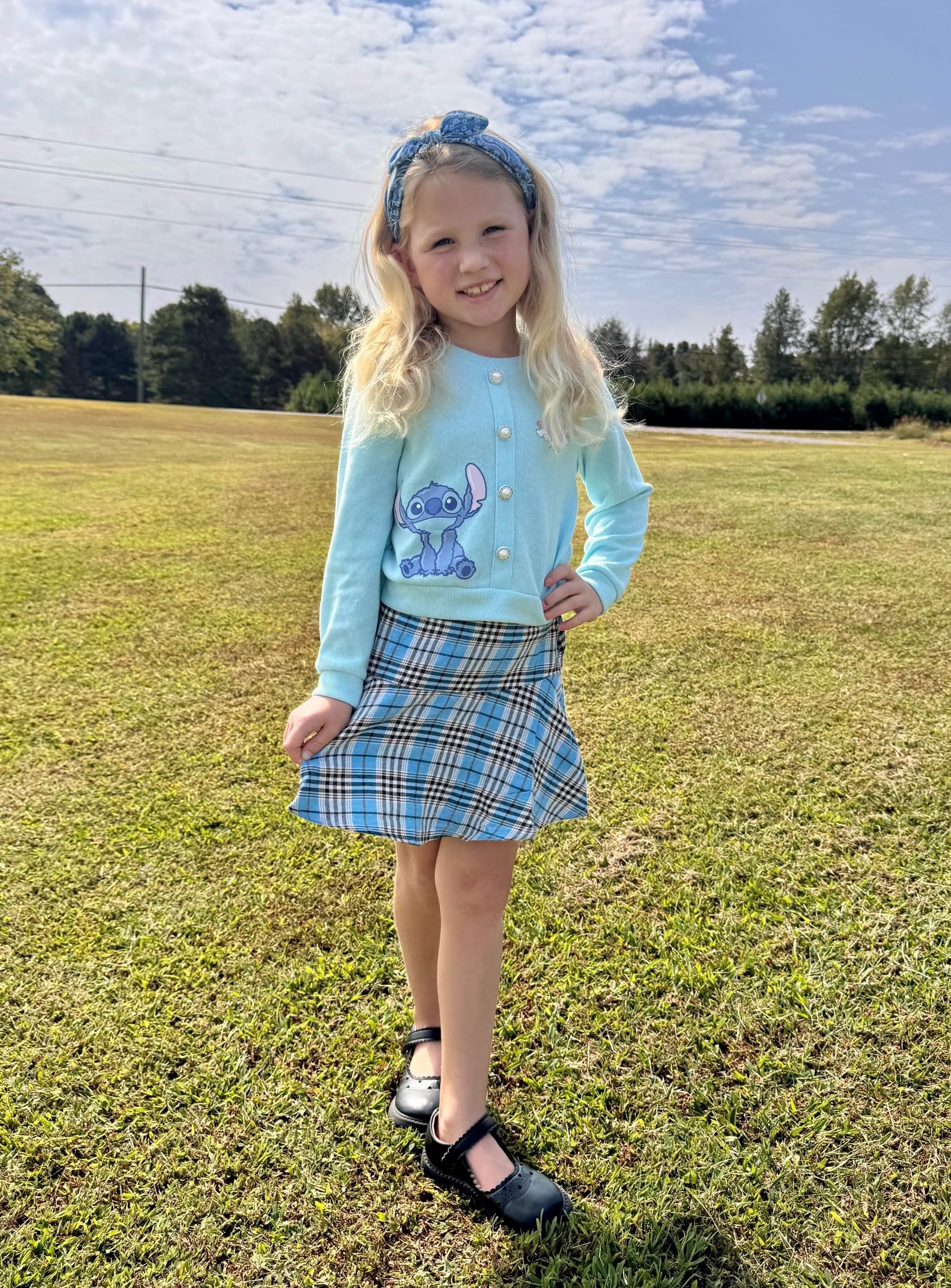 Elegant 2-Piece Design: This adorable Disney two piece skirt set includes a soft knit top with a bold Stitch graphic, pearl-style buttons, and Angel accents that add a fun touch. The look is completed with a plaid skirt crafted from tweed-style fabric, offering cozy texture and classic flairโideal for fall and winter styling