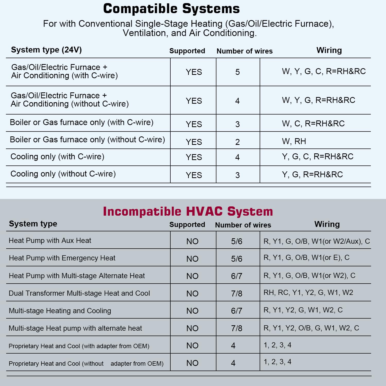 Not Compatible with the following systems: HVAC Central Air Conditioner Heat Pump System( with Aux or Emergency heating), Multistage Heating & Air Conditioning, 3-wire Hydronic (Hot Water), Dual Fuel/Hybrid Heating, Mini Split Air Conditioning Systems, and 120/240V Electric Baseboard and Line Voltage systems, Convectors, Radiant Ceiling Heat, RV Thermostats.
