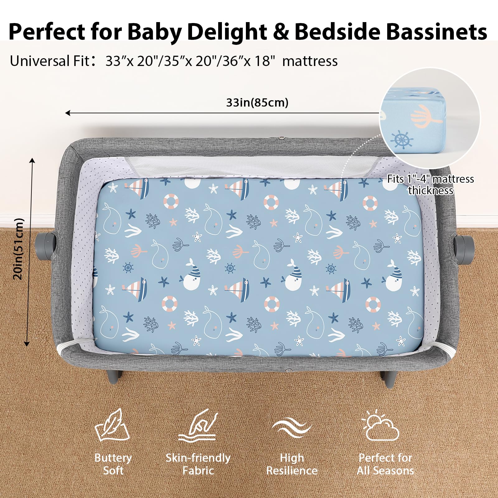 Snug Fit: Measuring 33” x 20”, the 3 pack bassinet fitted sheets fit most bedside sleeper bassinet mattresses. With full elastic edges of the bassinet sheets, a 6-inch deep pocket, and stretchy fabric, they ensure a snug, wrinkle-free fit that stays securely in place, even during your baby’s most active nights.