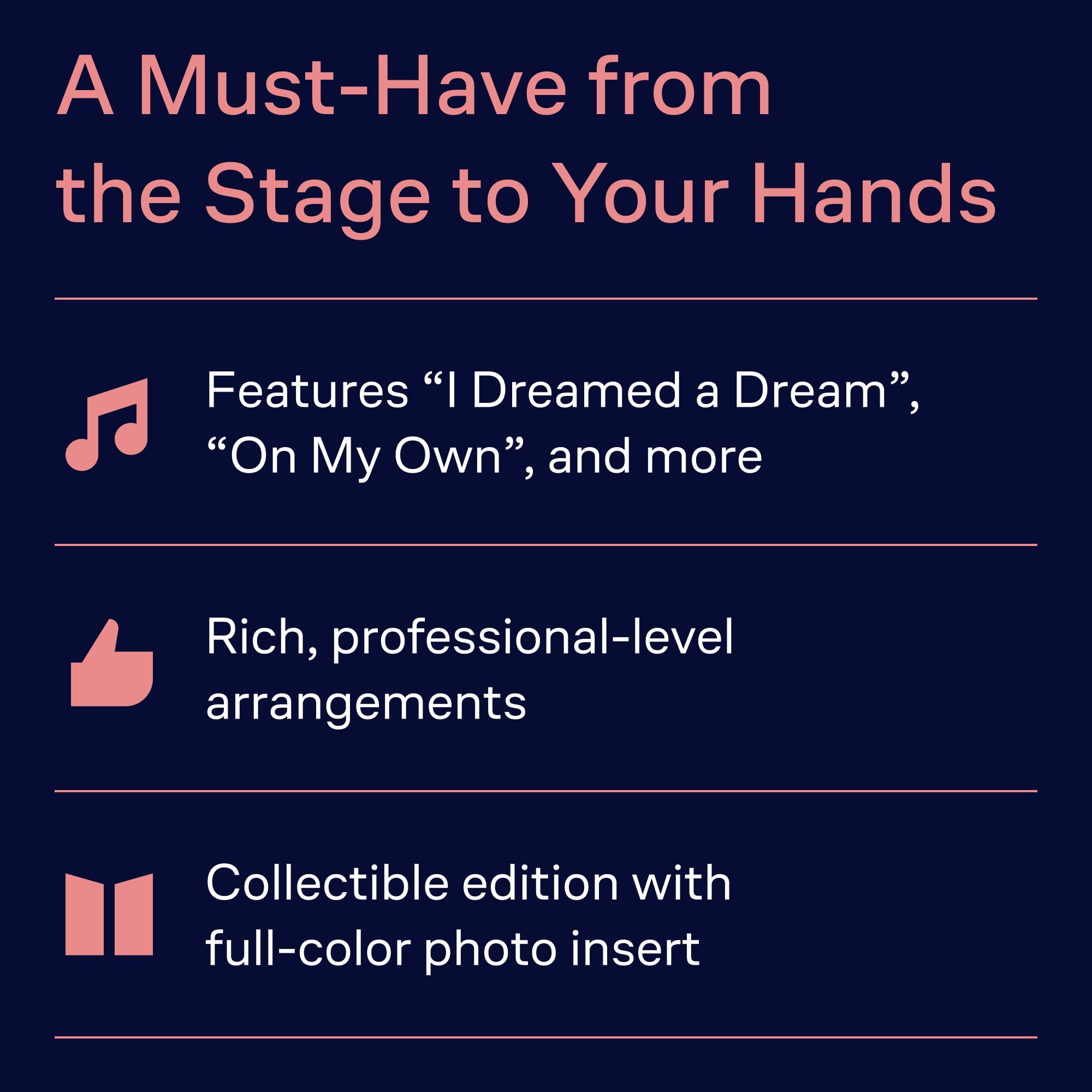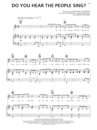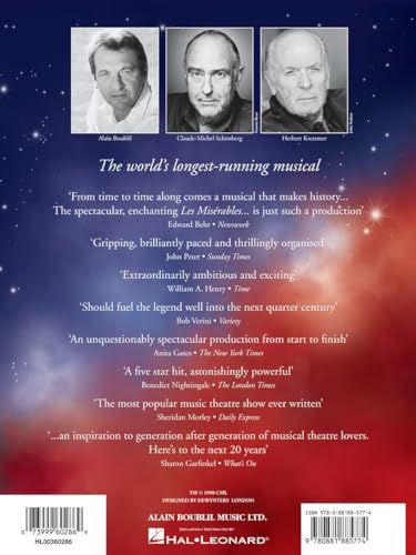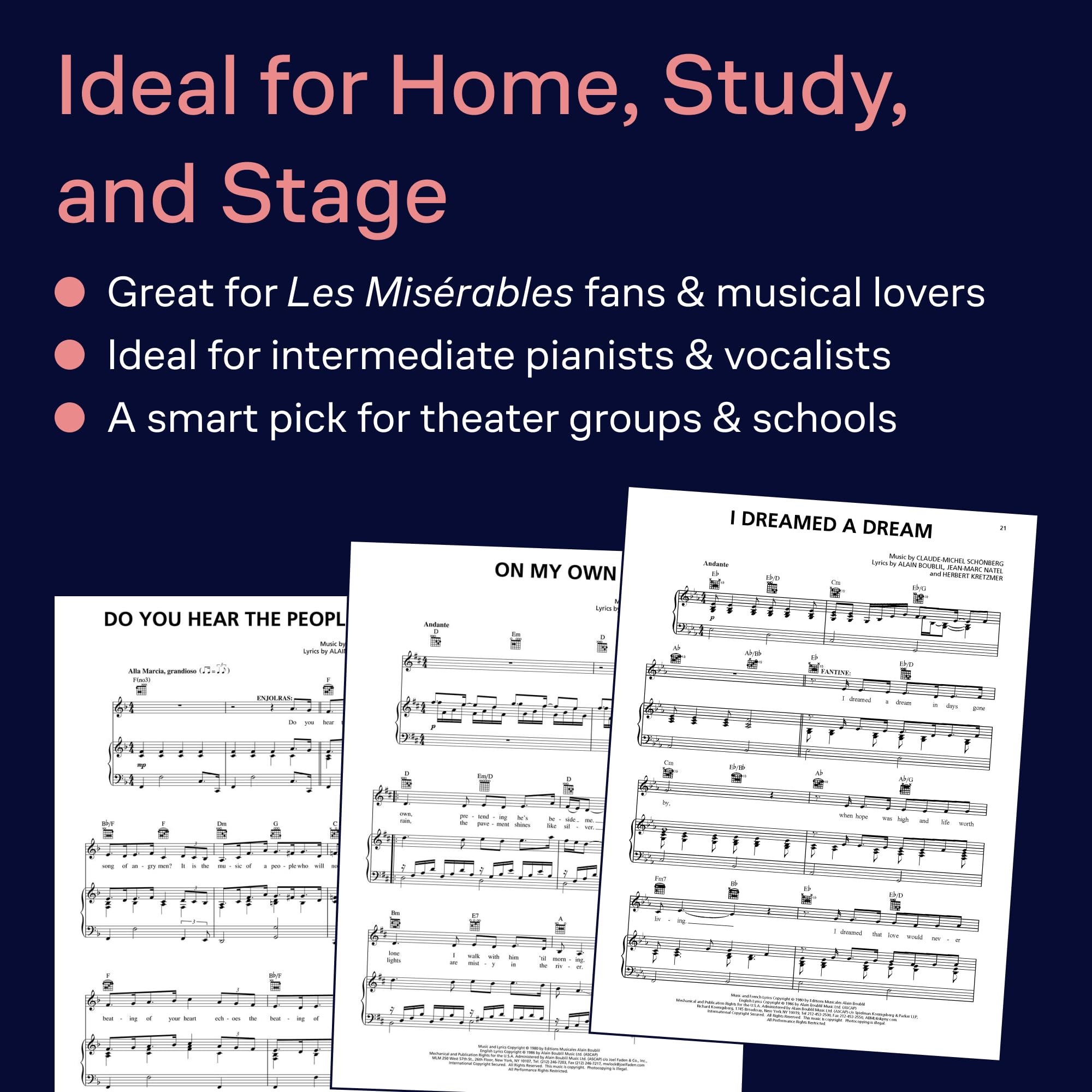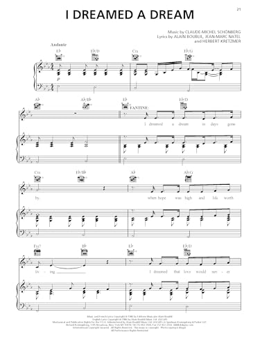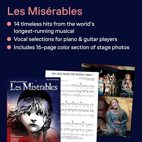 Les Misérables - Vocal/Piano Selections. Experience the powerful music of Les Misérables with this vocal and piano selections book, featuring authentic Broadway arrangements for piano and voice. Perfect for musical theater fans, vocalists, and pianists, this collection allows you to bring the magic of the stage into your home. Songs Included. This collection includes: At The End Of The Day * Bring Him Home * Castle On A Cloud * Do You Hear The People Sing? * Drink With Me (To Days Gone By) * Empty Chairs At Empty Tables * A Heart Full Of Love * I Dreamed A Dream * In My Life * A Little Fall Of Rain * Master Of The House * On My Own * Stars * Who Am I? Authentic Broadway Arrangements. This book provides accurate transcriptions, allowing pianists to accompany vocal performances or play as a solo pianist. The arrangements capture the original emotion and intensity of the musical, making them ideal for practice, auditions, and performances. Perfect for Vocalists and Pianists. Whether you are a student, a professional performer, or a Broadway enthusiast, this songbook is a valuable addition to your collection. It includes melody lines, piano accompaniment, and lyrics, making it suitable for solo practice, recitals, and auditions. A Must-Have for Broadway Fans. Looking for the perfect gift for a musical theater lover? This Les Misérables piano and vocal selections book is essential for anyone who wants to recreate the unforgettable melodies and lyrics of this iconic show. Start playing today with Les Misérables – Vocal/Piano Selections.