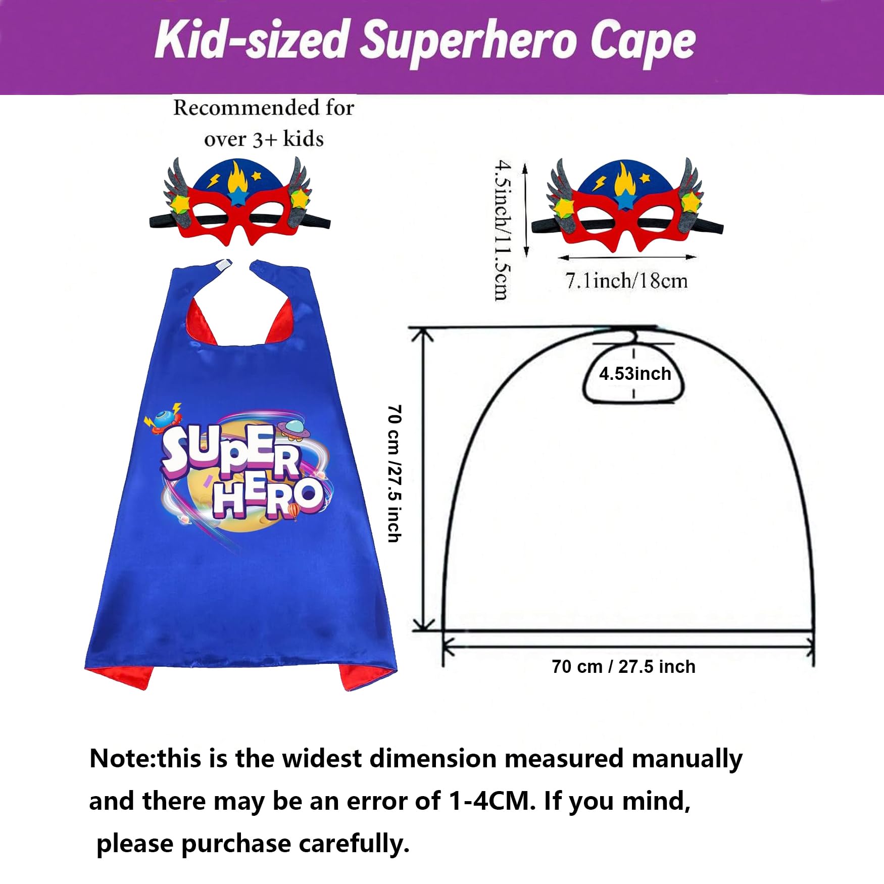 CAPES for KIDS SIZE: This Children's superhero cape, 27.5 inches long x 27.5 inches wide,recommended for children aged 3+; This collar use an adjustable buckle to adjust the collar. and the superhero mask with flat elastic bands be suitable