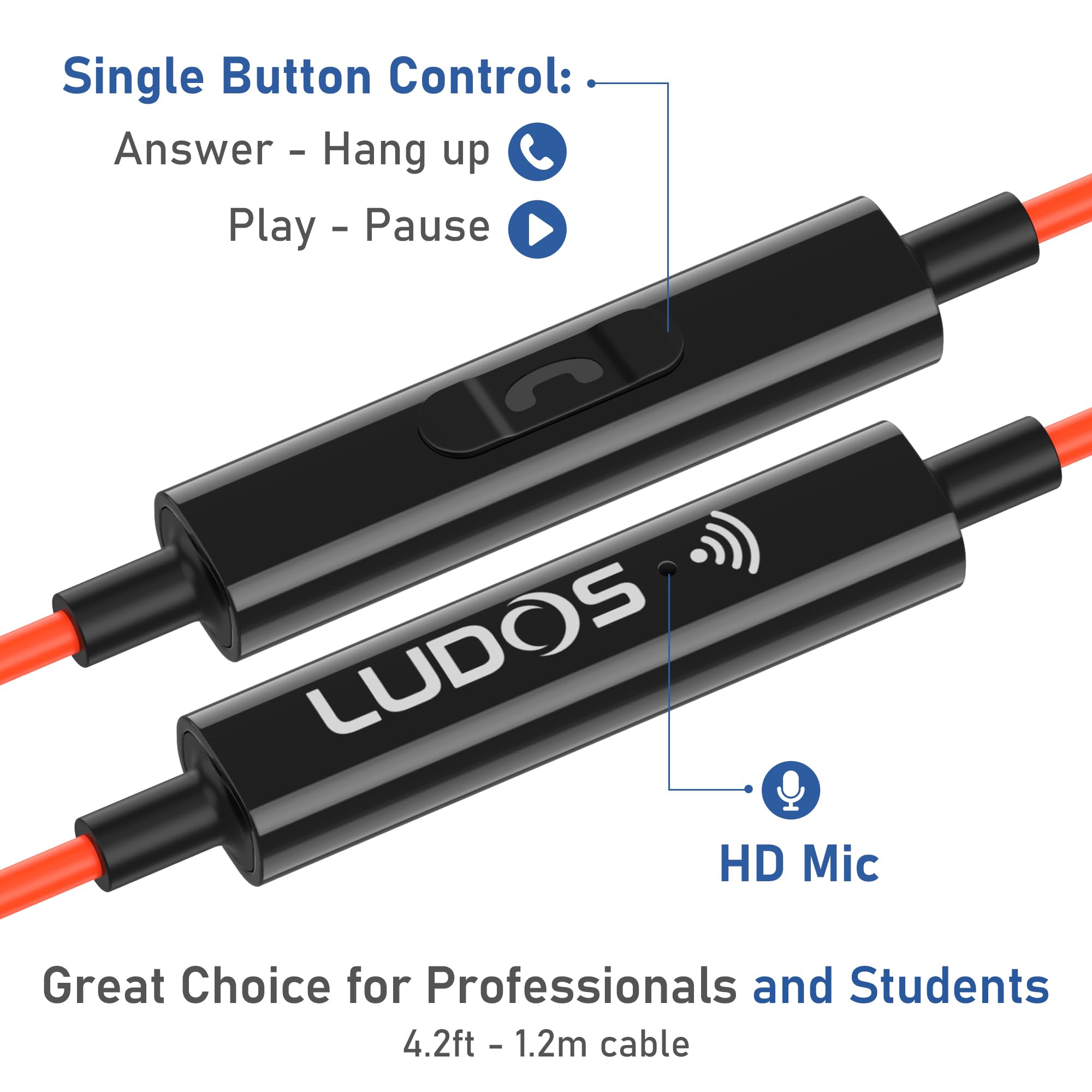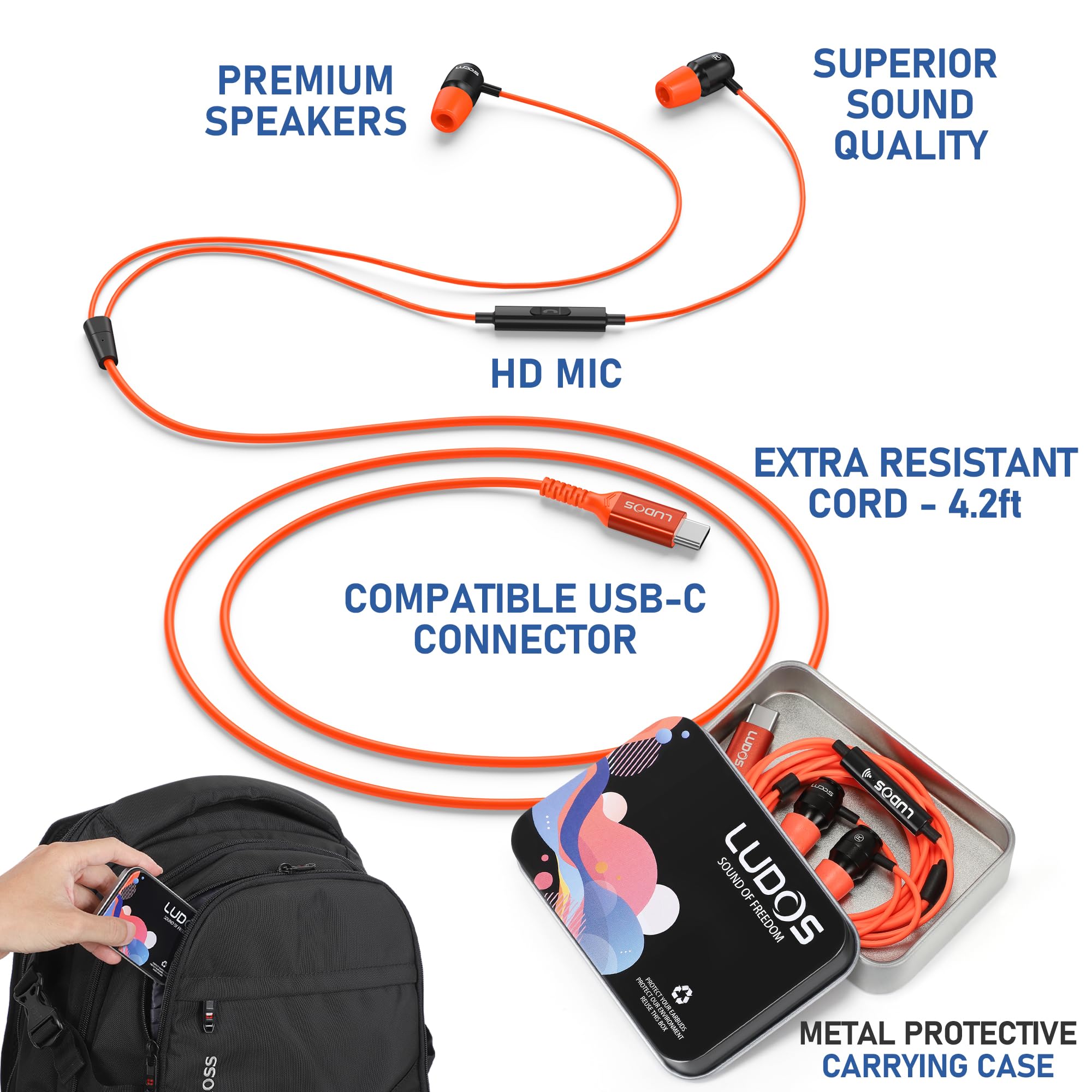 BUILT FOR HOURS OF COMFORTABLE WEARING – These USB C headphone feature rock solid design and a extra long 4.2 ft cord; earphones wired with mics are designed to be super tough and withstand the most demanding conditions; When you need wired ear buds for performance, trust only LUDOS