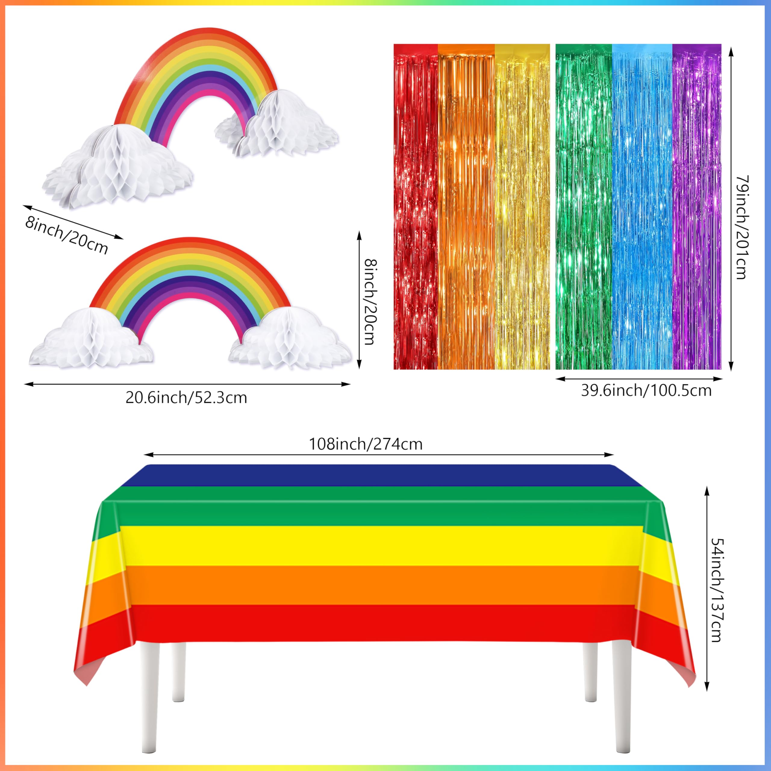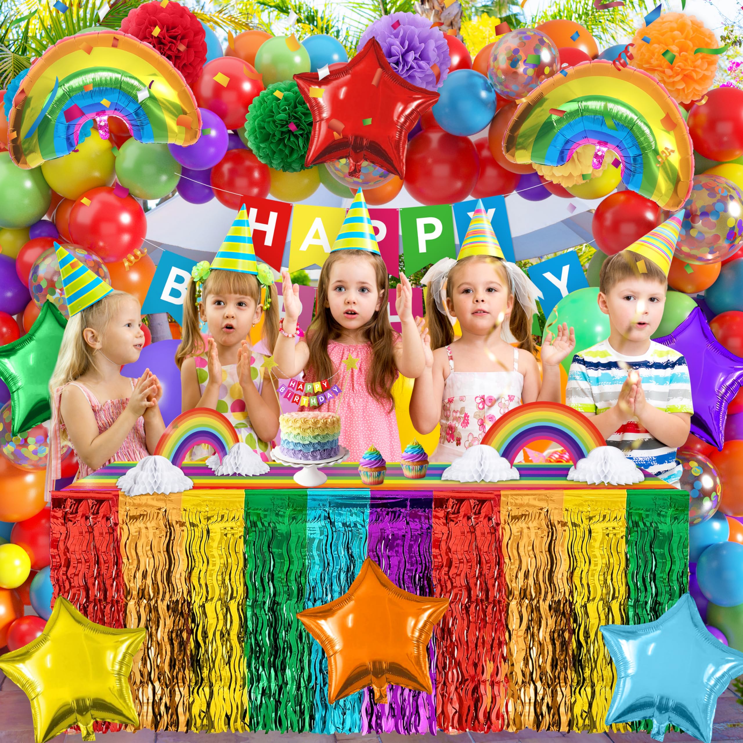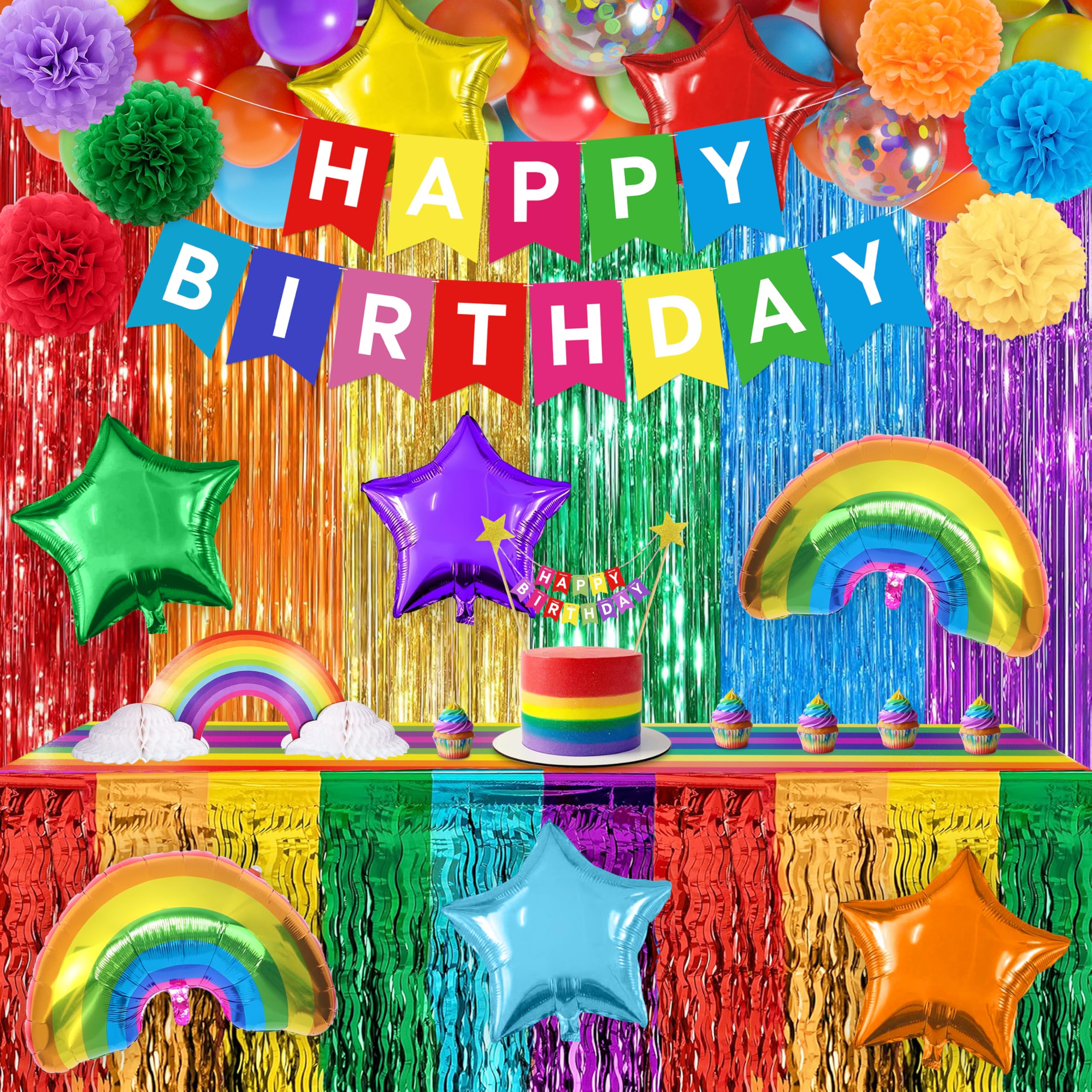 Rainbow Birthday Party Decorations: Our rainbow party decorations include 1 pack of red orange yellow and green blue purple foil fringe curtains, 1 happy birthday banner, 1 happy birthday cake topper, 2 rainbow cloud honeycomb centerpieces, 1 rainbow tablecloth, 6 paper flowers, 78 latex balloons(white, red, yellow, blue, green, violet, orange, colorful sequins), 8 colorful pentagram aluminum balloons, 2 rainbow aluminum balloons and 3 balloon assembly tools