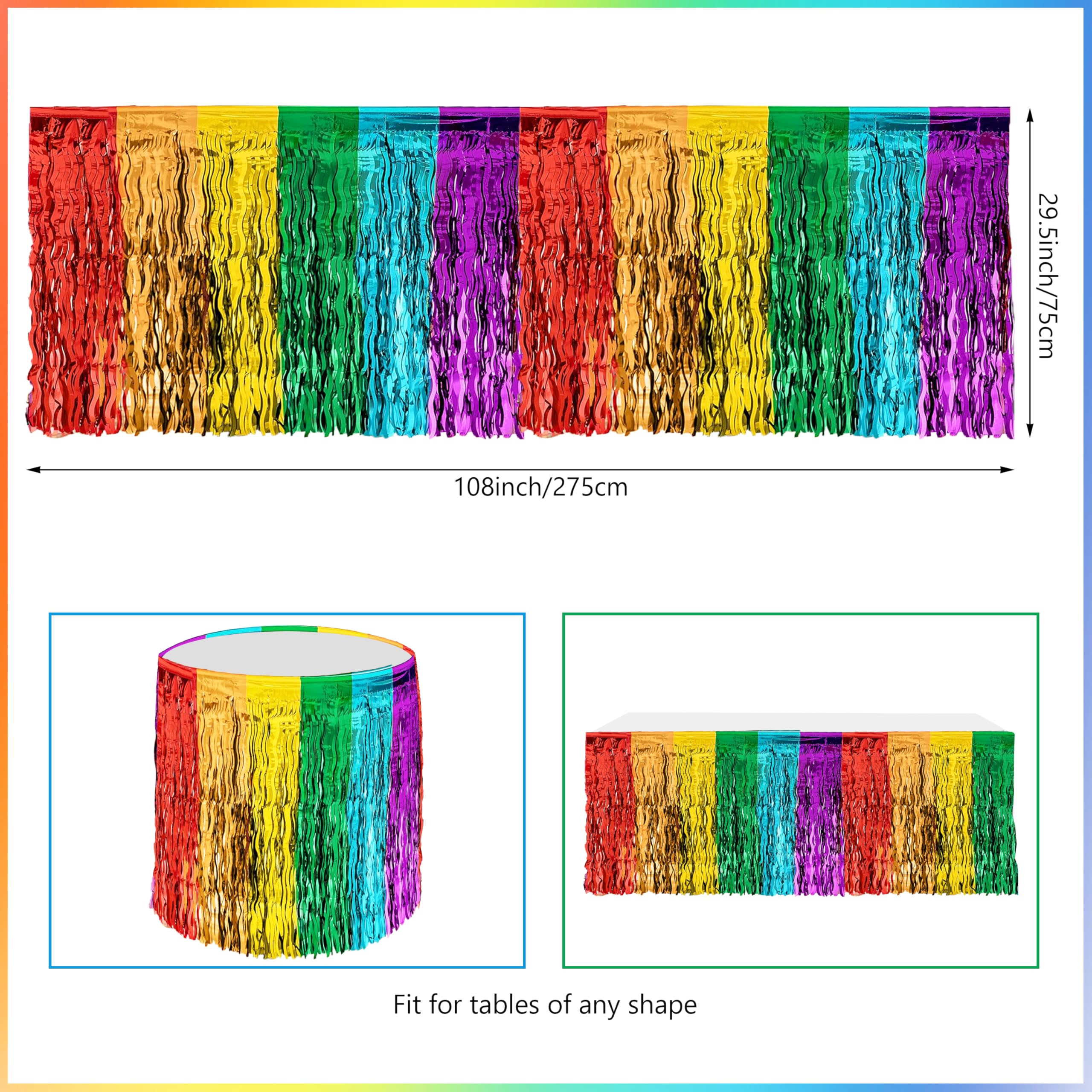 Easy to Use: Each fringe curtain and rainbow wave-shaped table skirt comes with self-adhesive tape on the top, just peel off the tape and then stick to the top of a wall, window, table, door, or wherever you want to decorate. Use the included tool to make a beautiful rainbow balloons garland, it will make a perfect celebration party backdrop when paired with the foil fringe curtain and table skirt