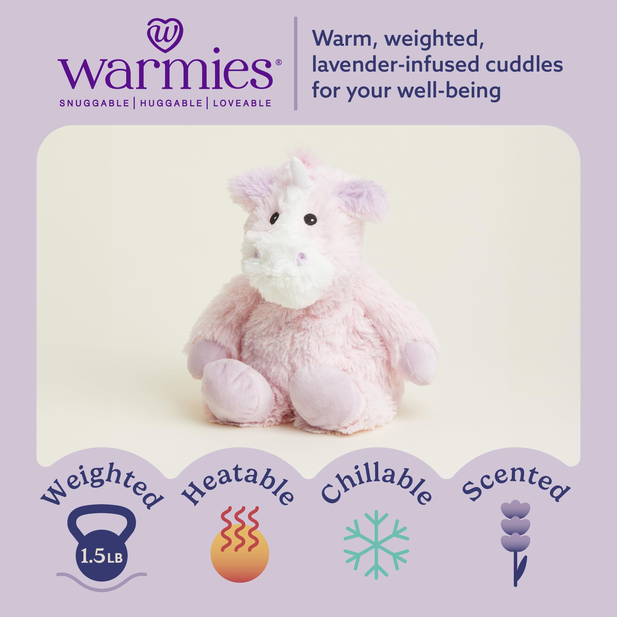 Warmies Microwavable Stuffed Animal: Unicorn is a snuggable, huggable, lovable weighted plush toy for all ages that can be easily heated for hours of soothing warmth and calming comfort or chilled to provide cooling relief. 13 inches tall. 1.5 lbs.