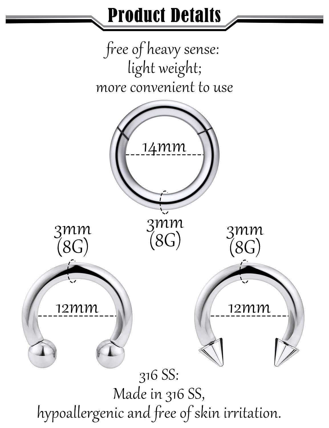 Gauges Earrings Size Specification: 8 Gauge=3mm, Diameter is 1/2"(12mm),Ball Size are 6mm.Hinged Clicker Rings Diameter is 9/16"(14mm),