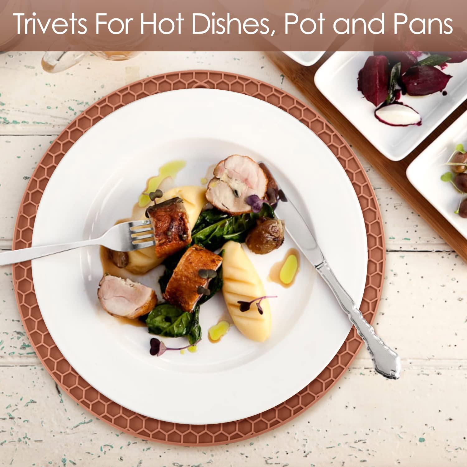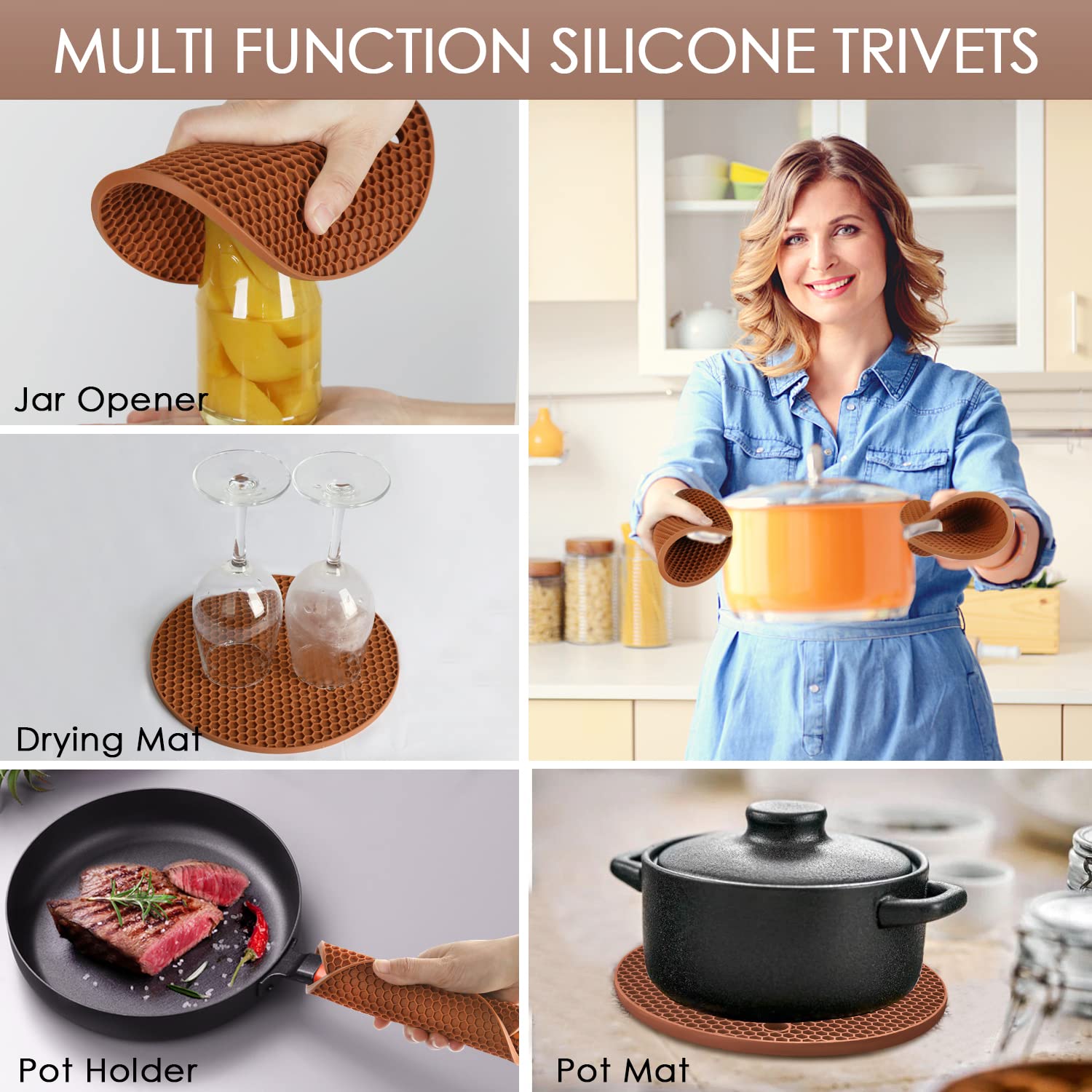 🎯 MULTIFUNCTIONAL TRIVETS - A must-have kitchen accessory. Save the valued kitchen space easily, each silicone trivet has a corner hole for convenient hanging storage and can use as a hot pad for countertops, spoon rest, utensil rest, small dish drying mat, Jar opener, silicone table mat, silicone coaster, garlic peeler, and brown hot pot holder.